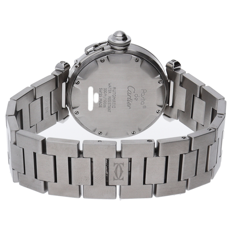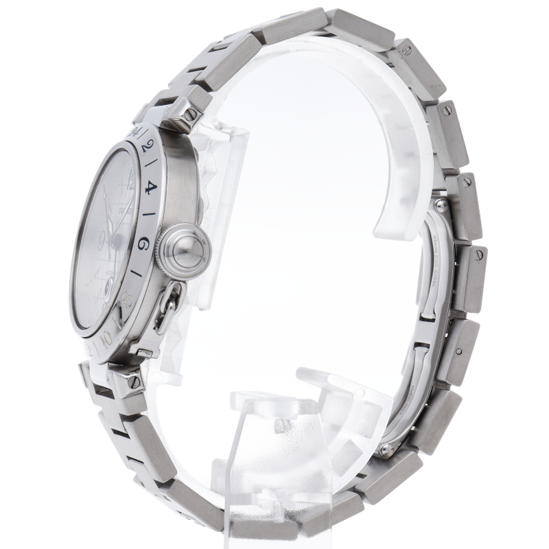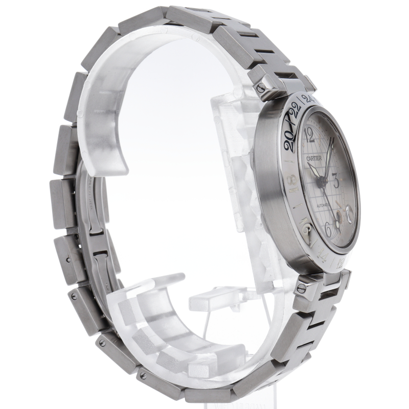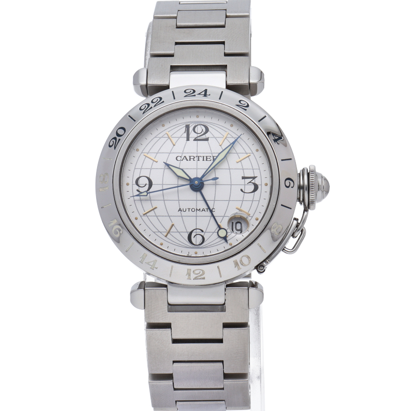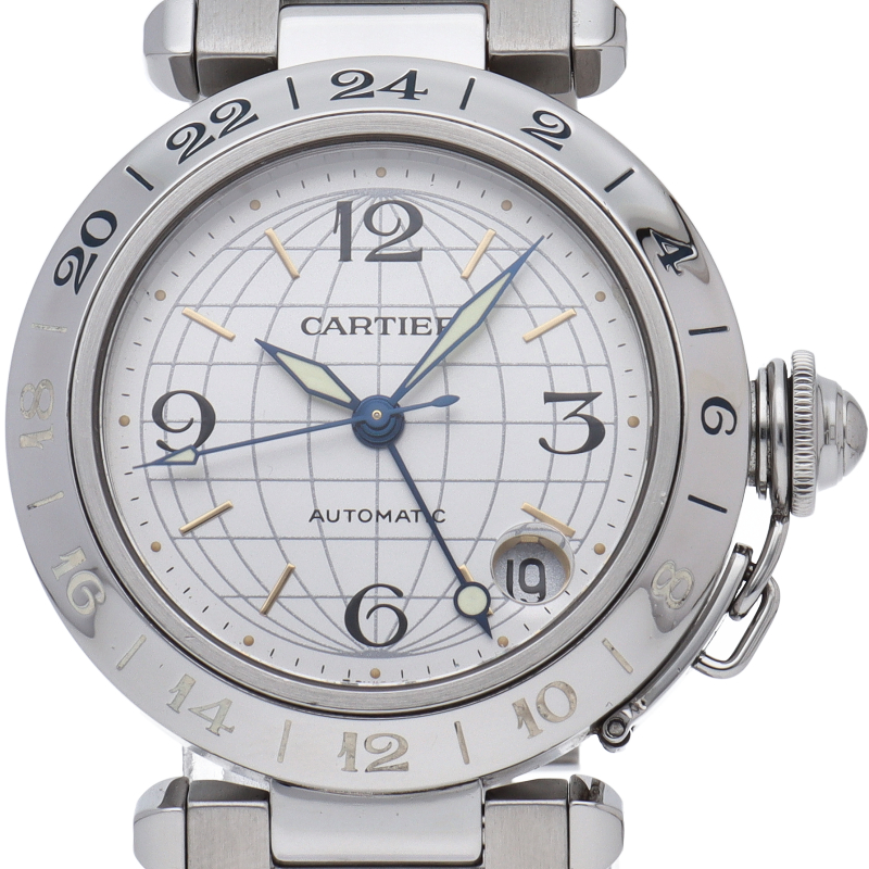 カルティエの人気「パシャC」シリーズ。文字盤に地球儀をモチーフにした放射線状のデザインを持つ、GMT機能搭載モデル。