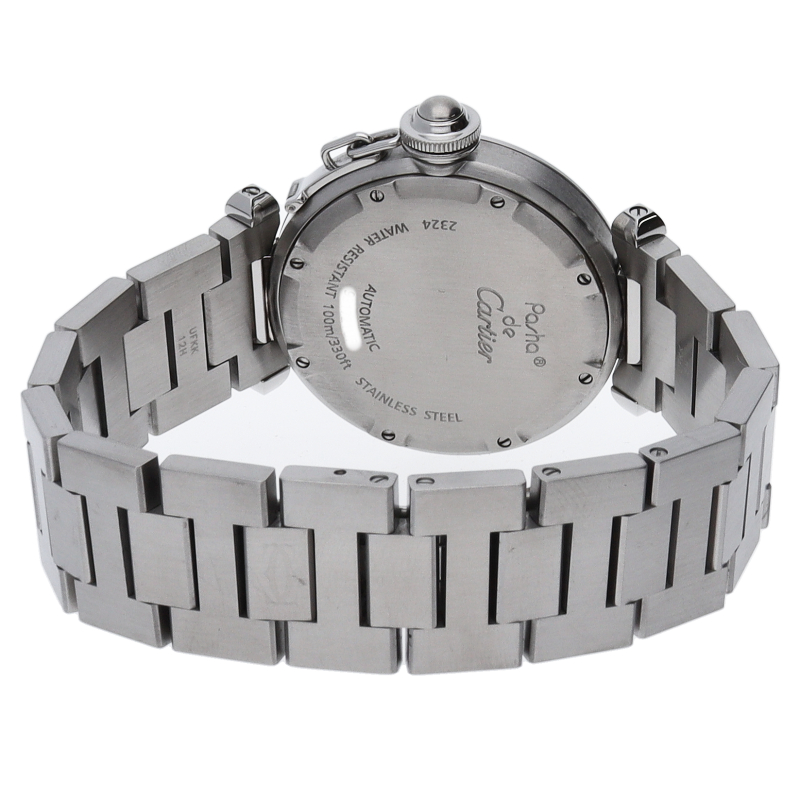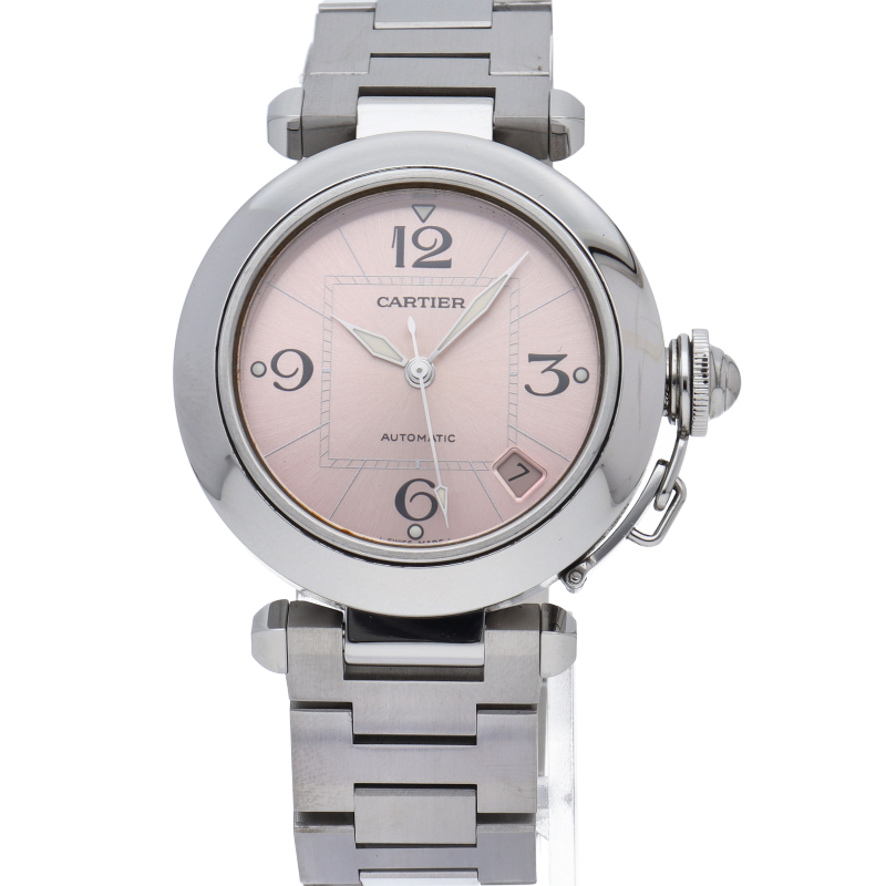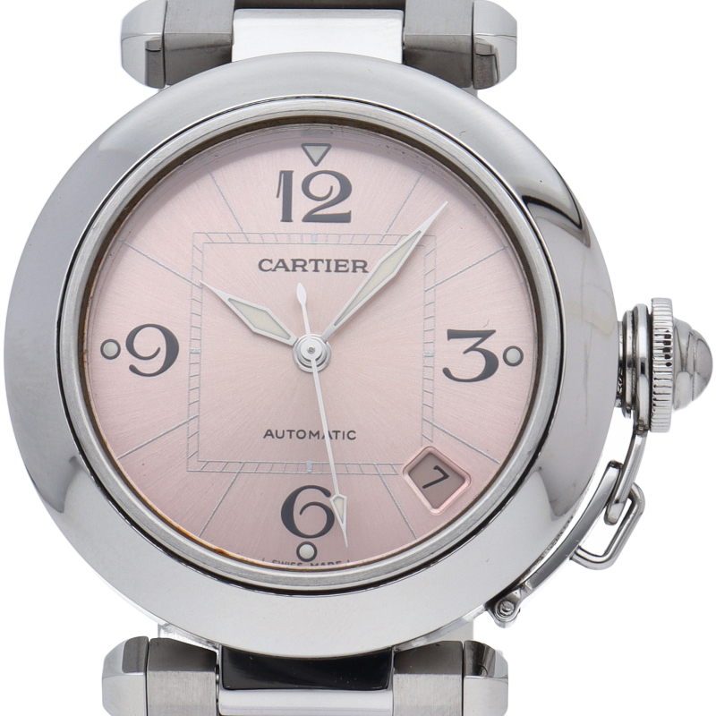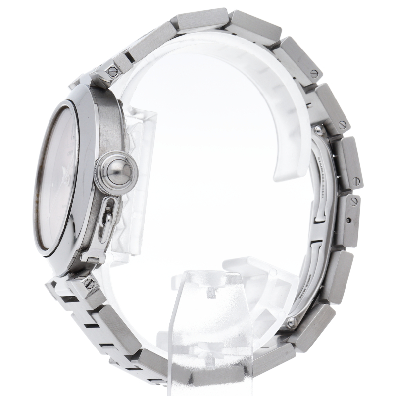 カルティエの人気パシャCシリーズ。4時と5時の間にデイト表示機能が付いた実用性のある1本。どんなシーンにも活用できるラウンドケースがオシャレです。