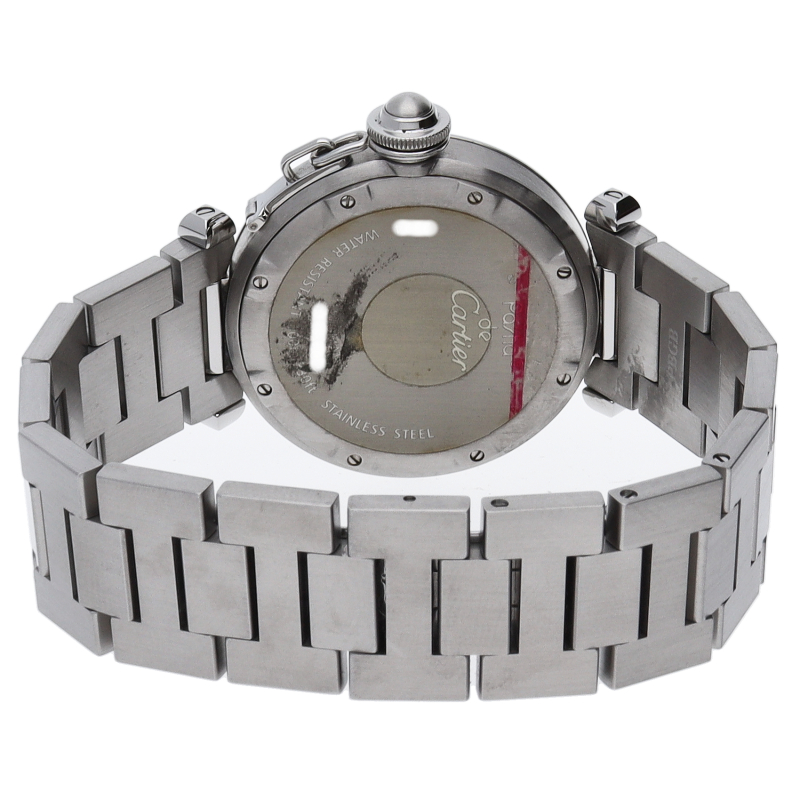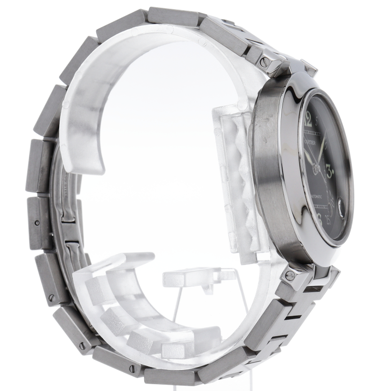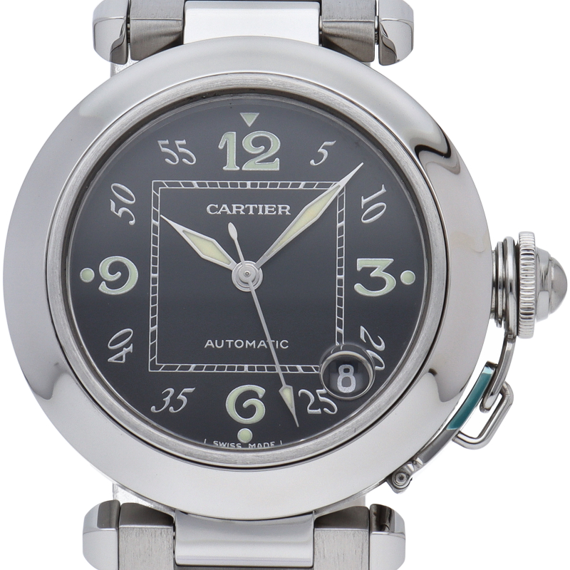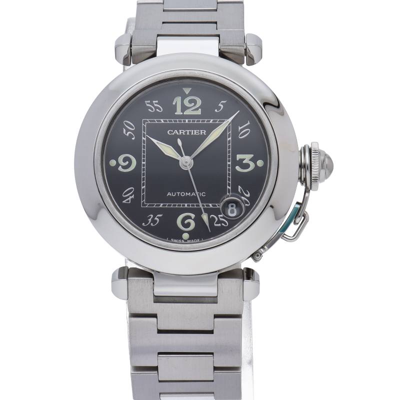 カルティエの人気パシャCシリーズ。4時と5時の間にデイト表示機能が付いた実用性のある1本。どんなシーンにも活用できるラウンドケースがオシャレです。