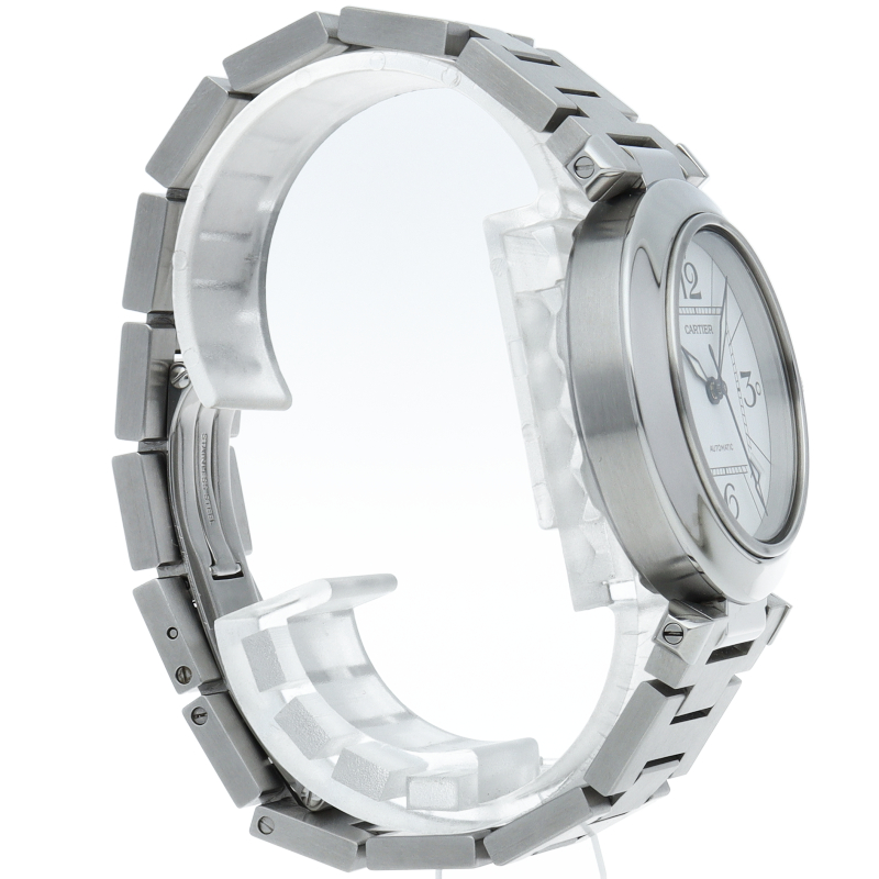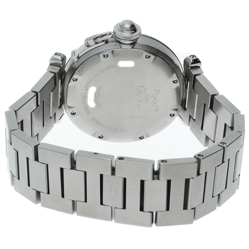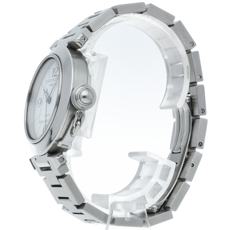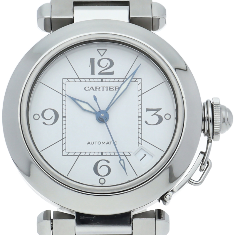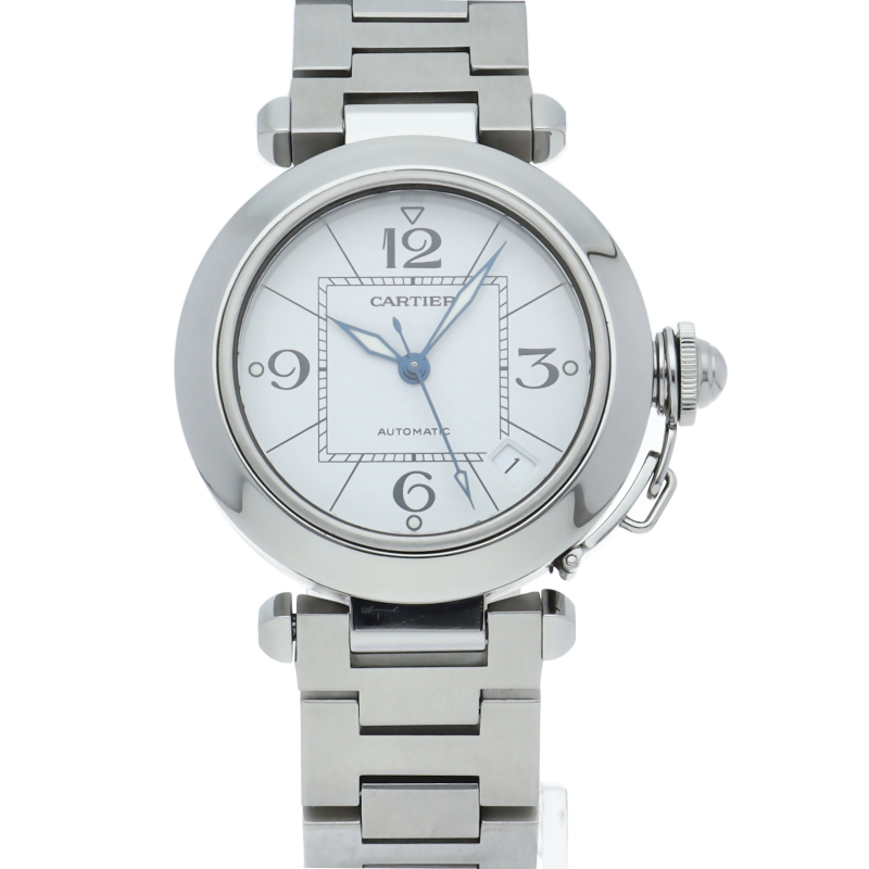 カルティエの人気パシャCシリーズ。4時と5時の間にデイト表示機能が付いた実用性のある1本。どんなシーンにも活用できるラウンドケースがオシャレです。