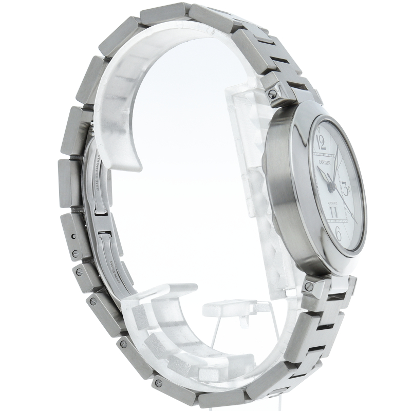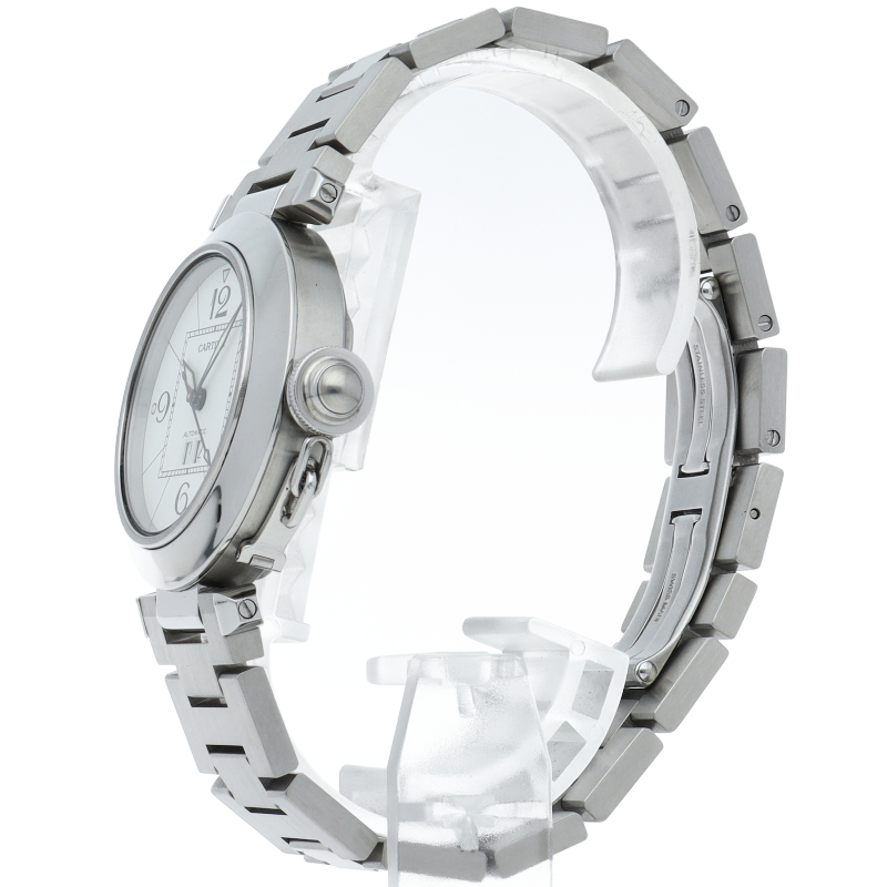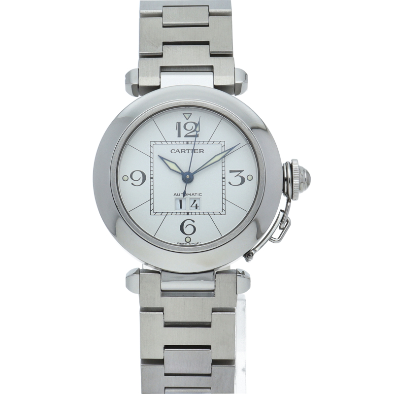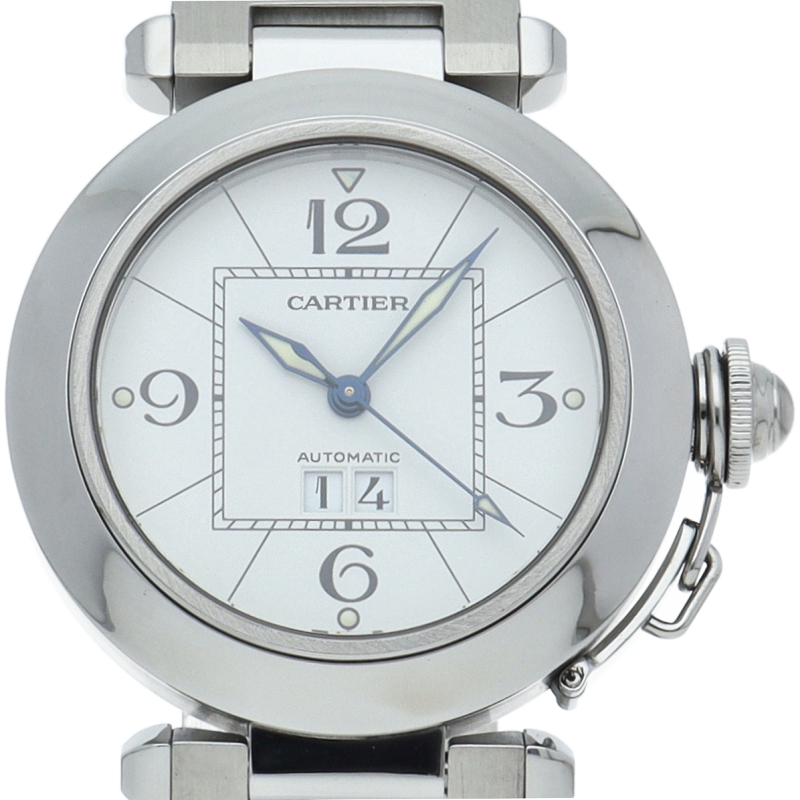 カルティエの人気「パシャC」シリーズ。大きい日付表示が特徴的なビッグデイト。視認性も良くどんなシーンにも活用できるラウンドケースがオシャレな1本。
