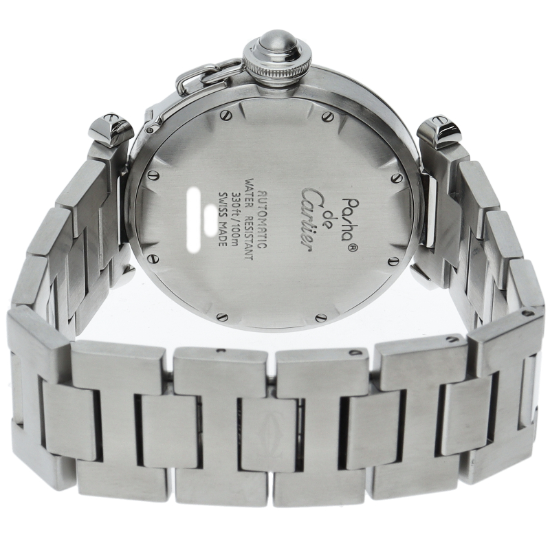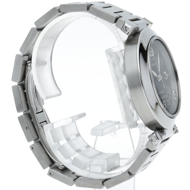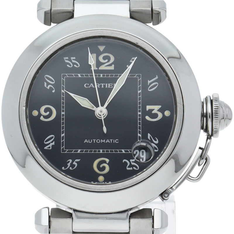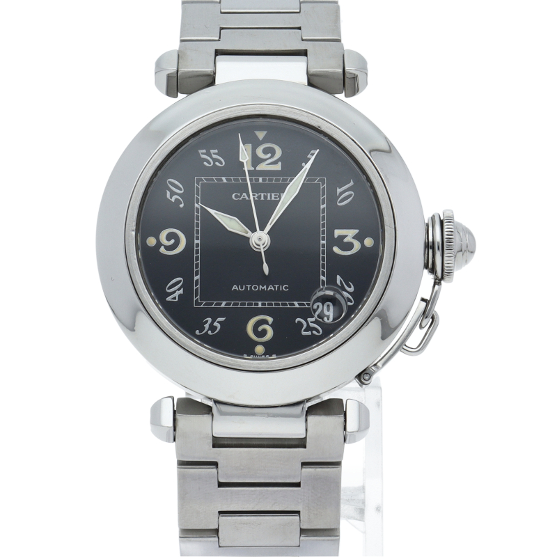 カルティエの人気パシャCシリーズ。4時と5時の間にデイト表示機能が付いた実用性のある1本。どんなシーンにも活用できるラウンドケースがオシャレです。