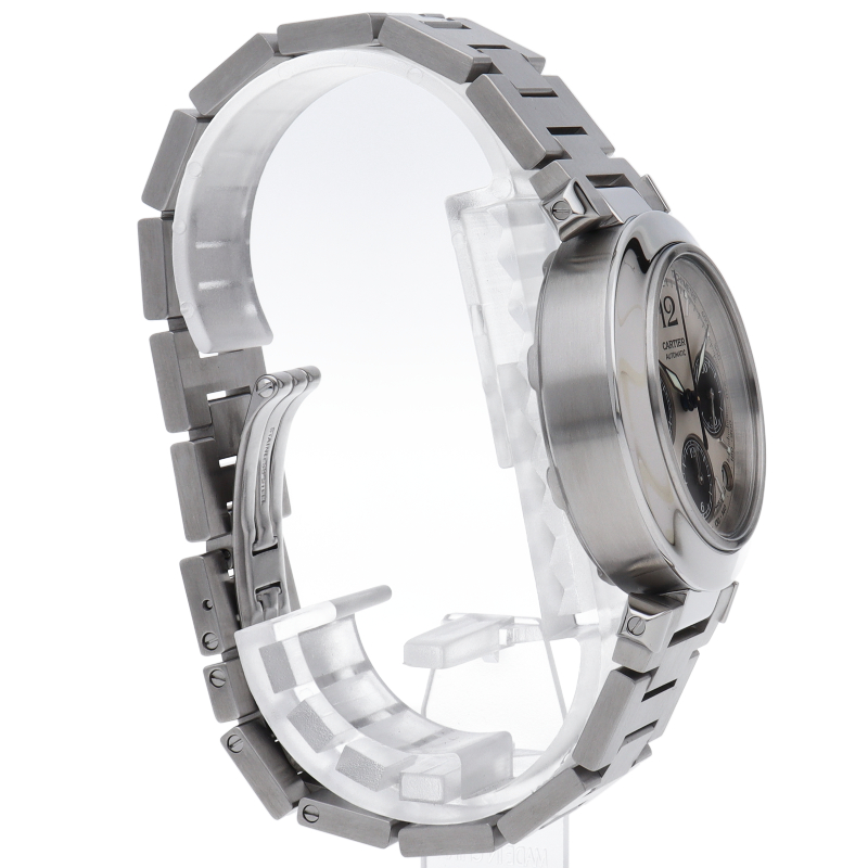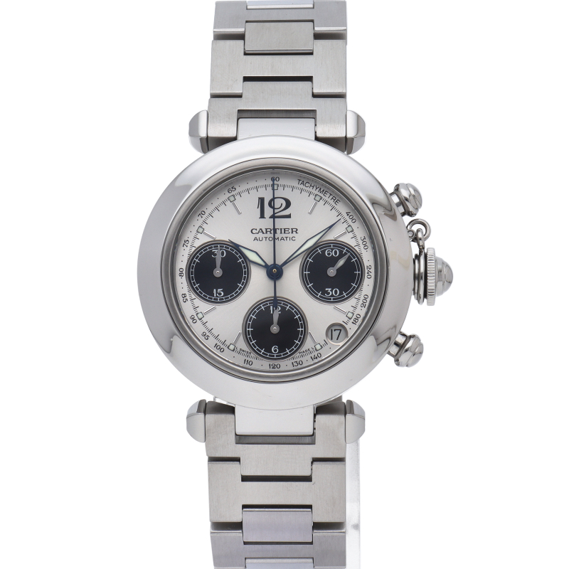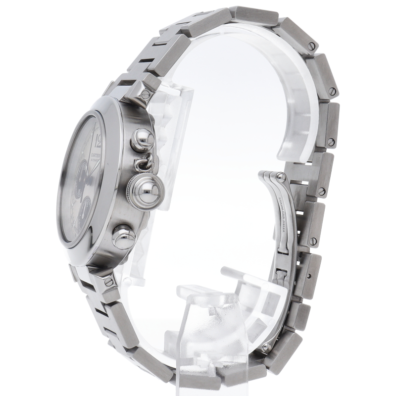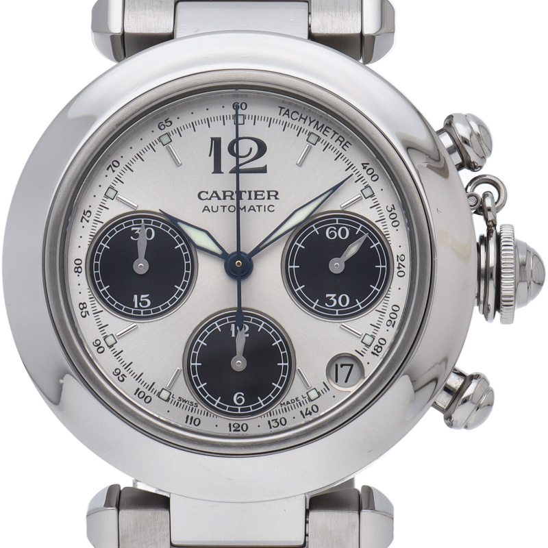 カルティエの人気「パシャC」シリーズ。クロノグラフを搭載したモデルでシルバーと黒の文字盤がシンプルかつお洒落な商品となっております。