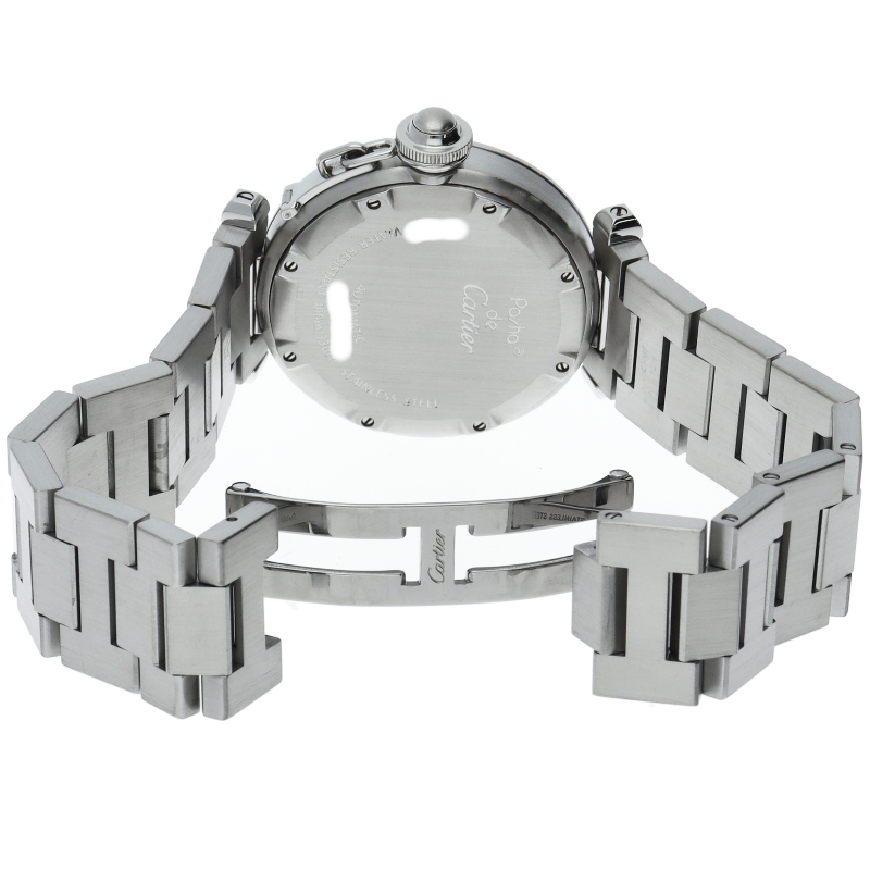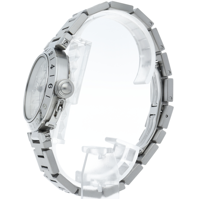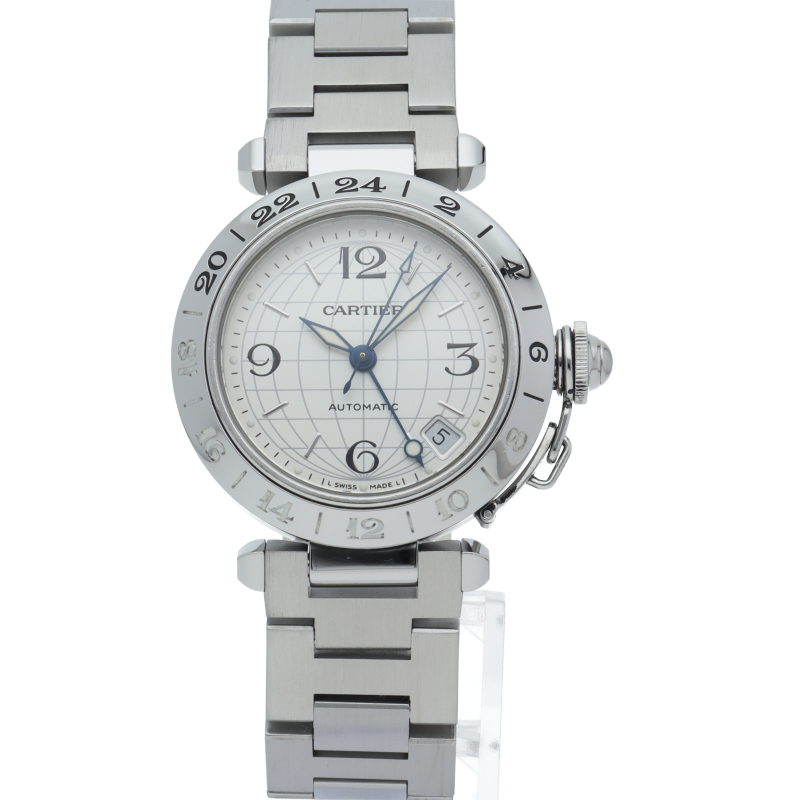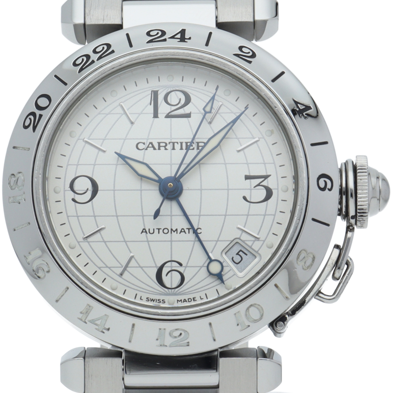カルティエの人気「パシャC」シリーズ。文字盤に地球儀をモチーフにした放射線状のデザインを持つ、GMT機能搭載モデル。