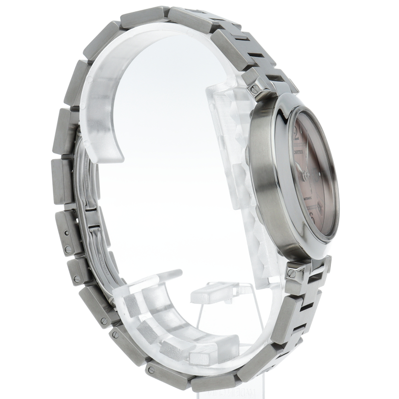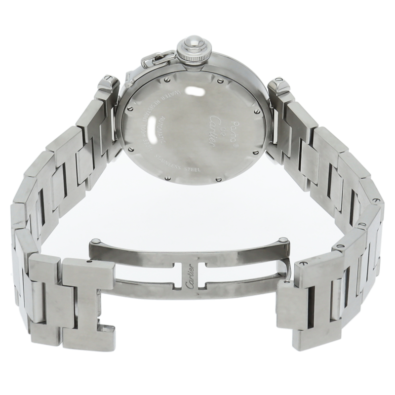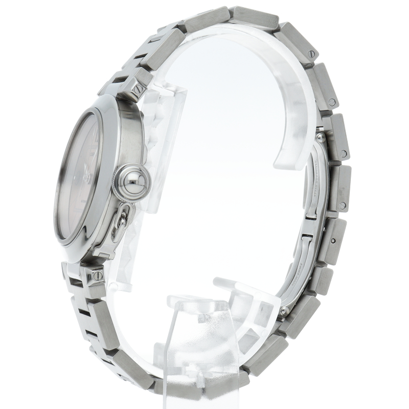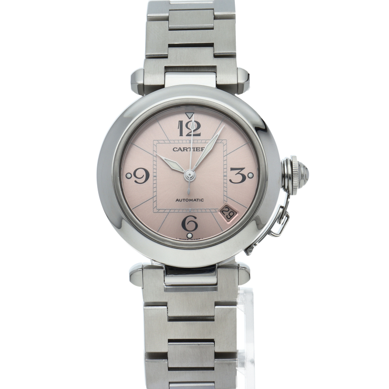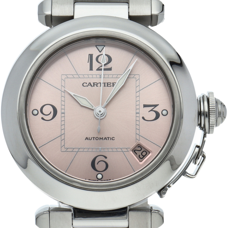 カルティエの人気パシャCシリーズ。4時と5時の間にデイト表示機能が付いた実用性のある1本。どんなシーンにも活用できるラウンドケースがオシャレです。