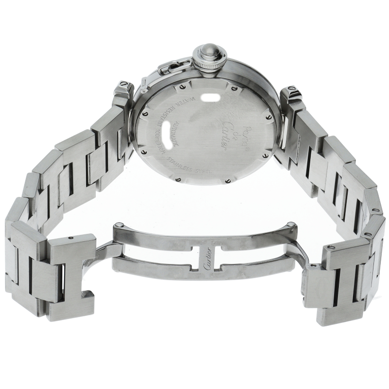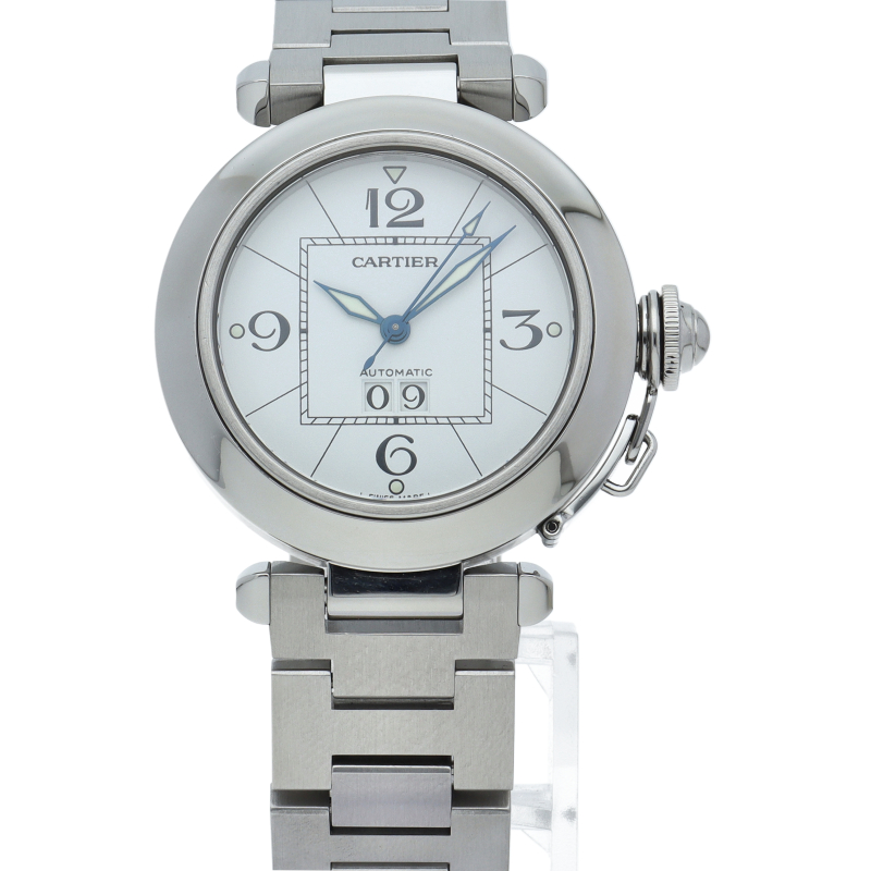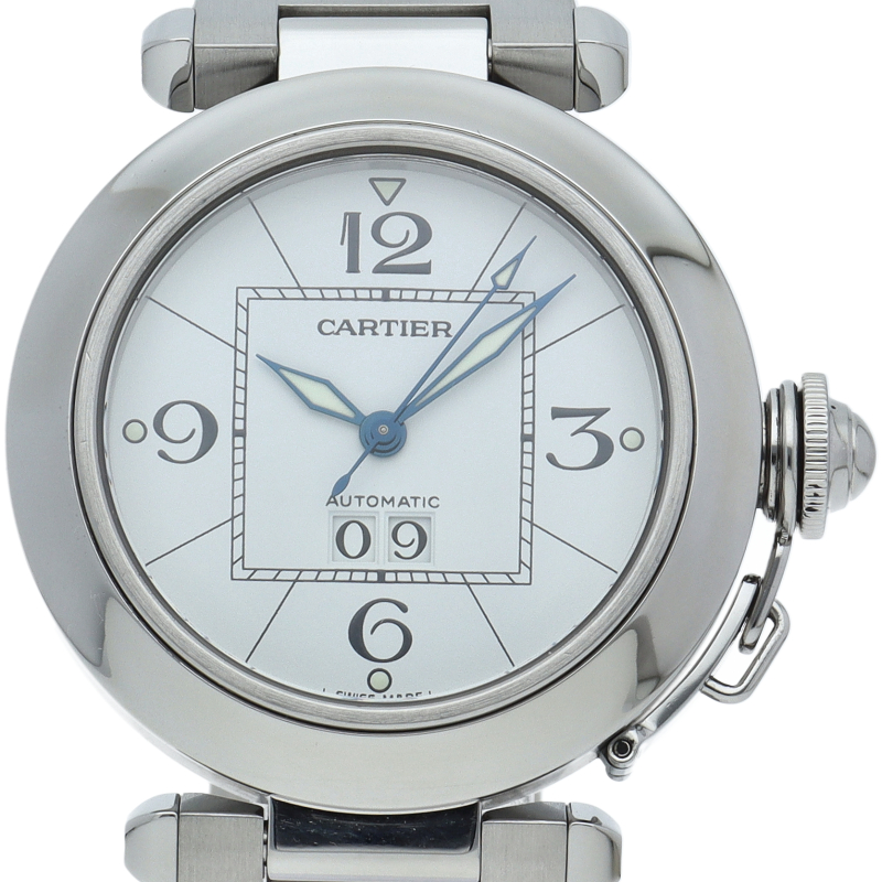 カルティエの人気「パシャC」シリーズ。大きい日付表示が特徴的なビッグデイト。視認性も良くどんなシーンにも活用できるラウンドケースがオシャレな1本。