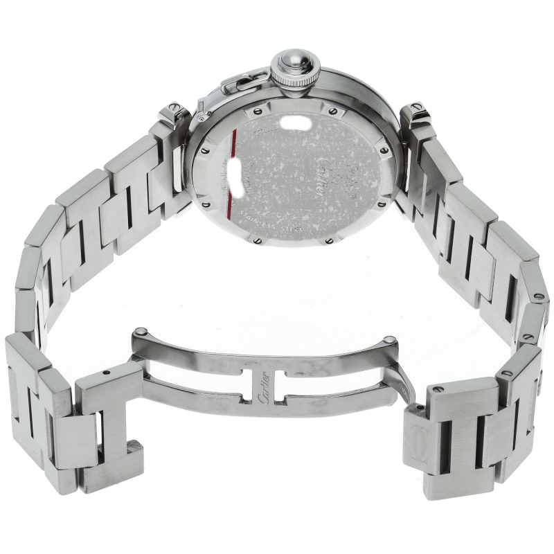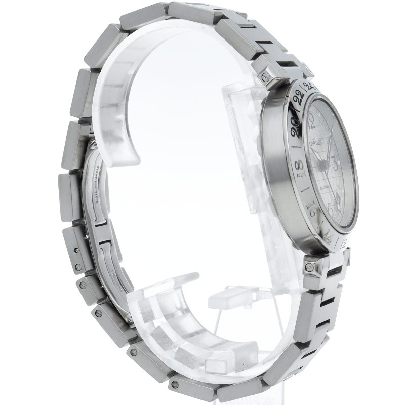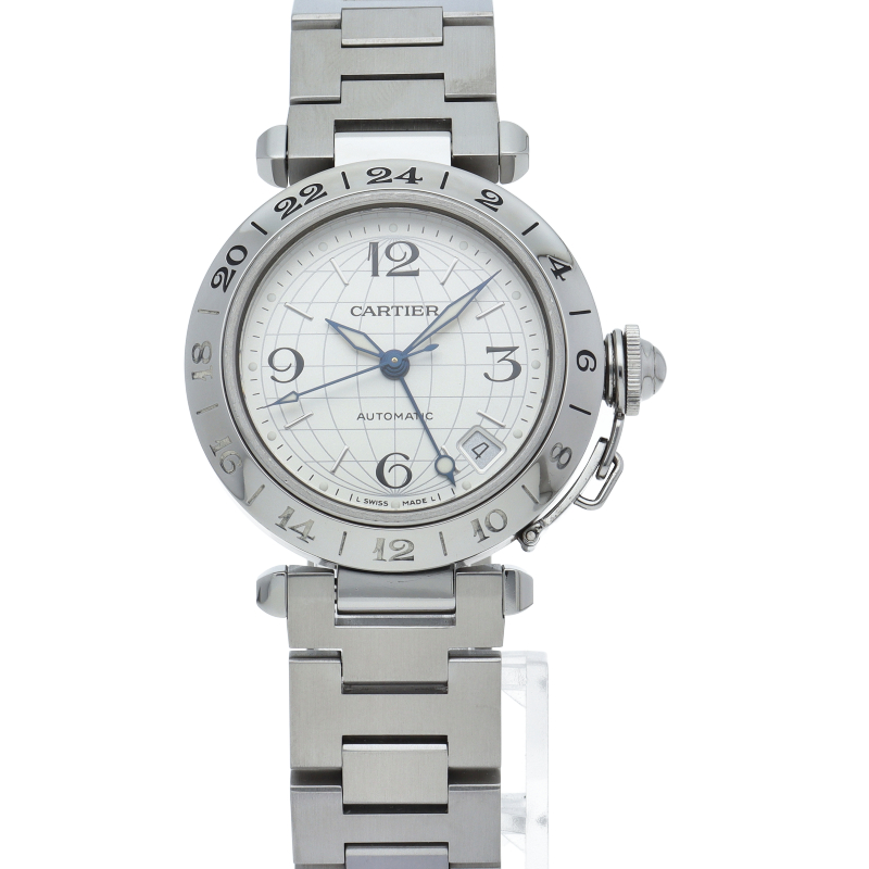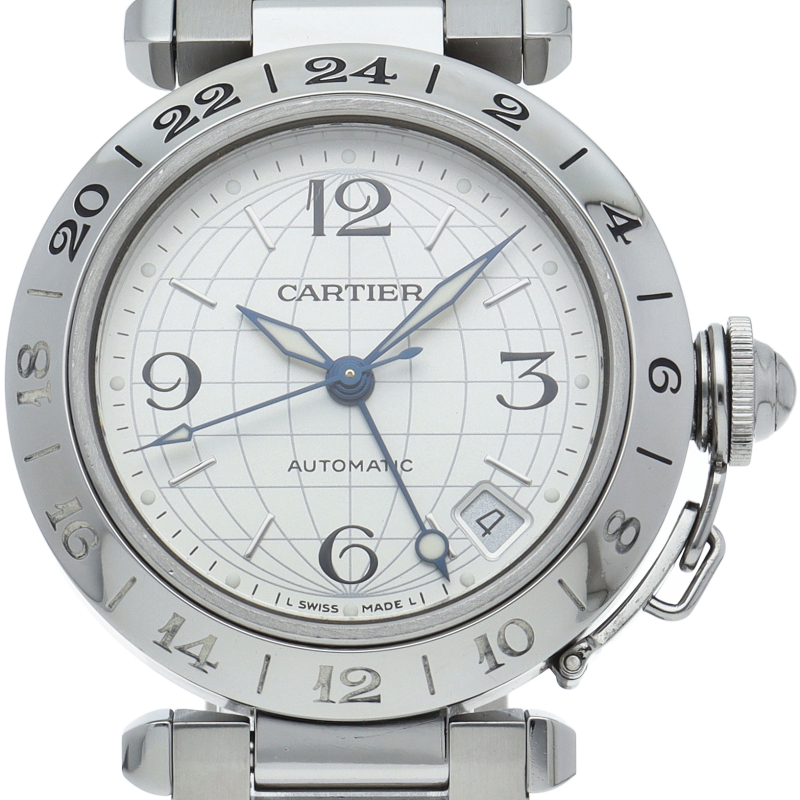 カルティエの人気「パシャC」シリーズ。文字盤に地球儀をモチーフにした放射線状のデザインを持つ、GMT機能搭載モデル。