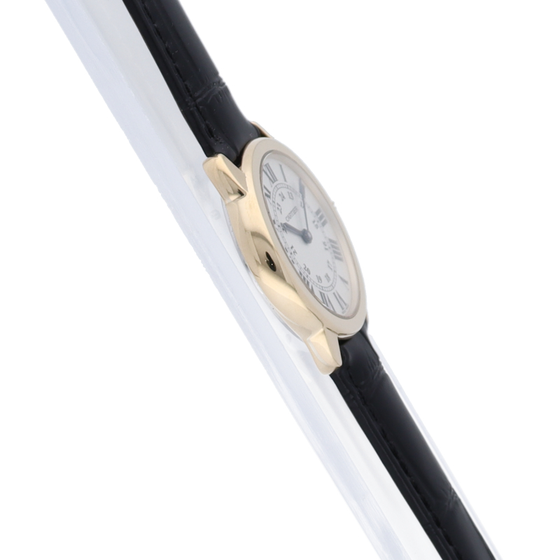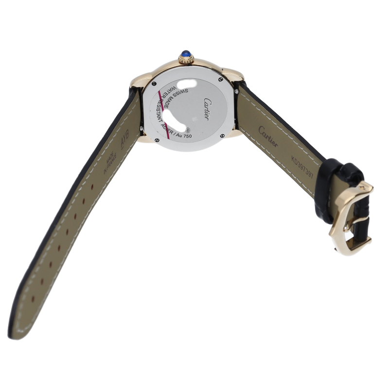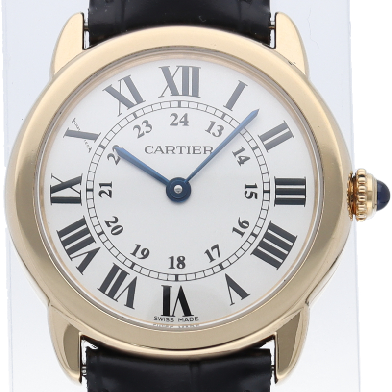 シンプルなデザインが人気の「ロンドソロ」。ブルースチールの針やローマンインデックスなどカルティエらしさが溢れています。