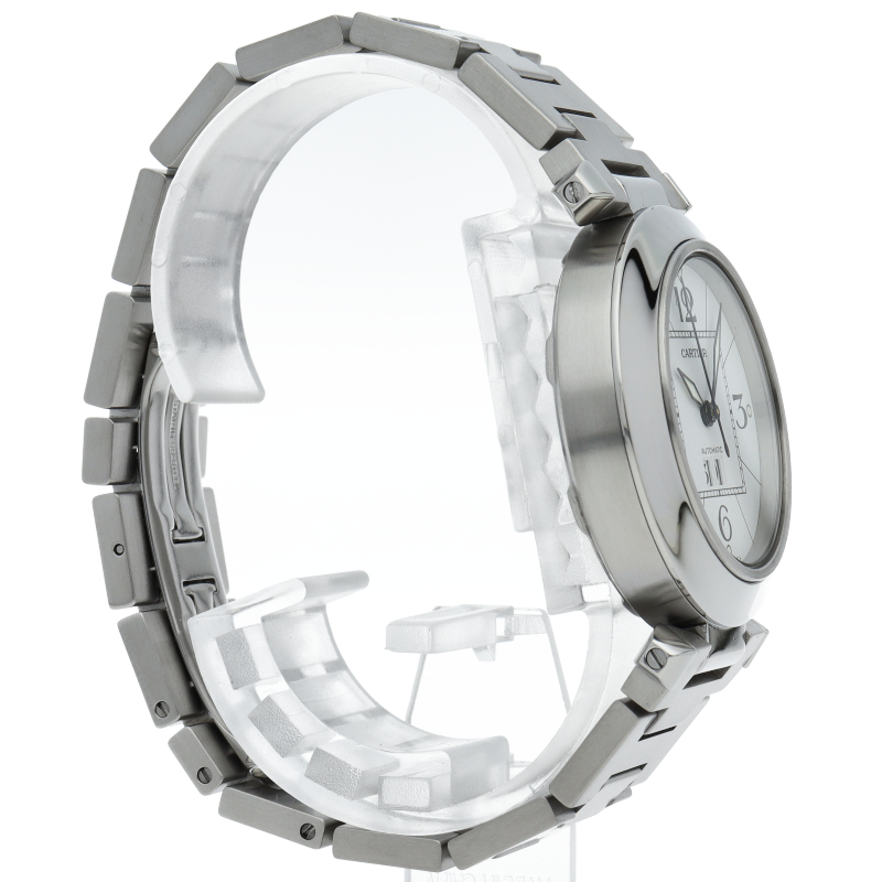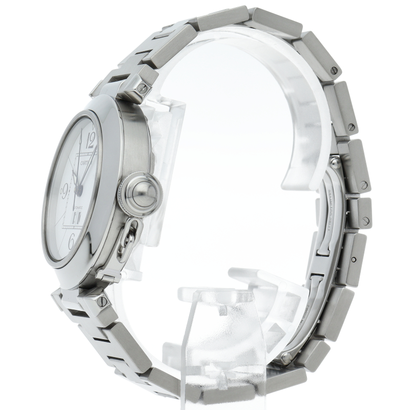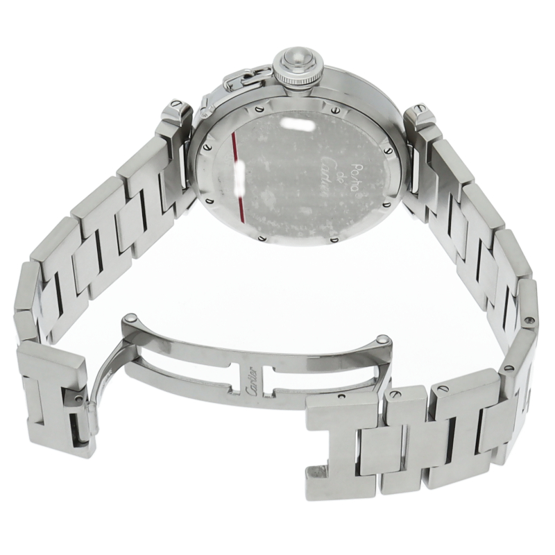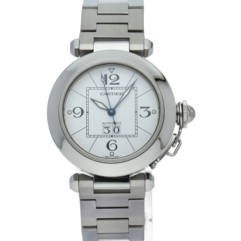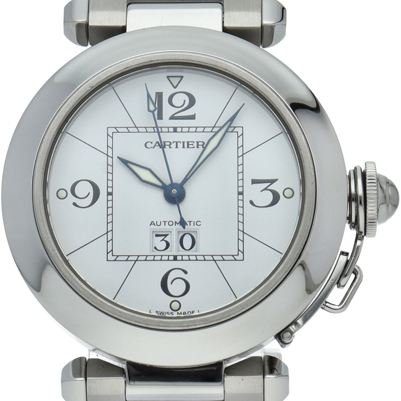 カルティエの人気「パシャC」シリーズ。大きい日付表示が特徴的なビッグデイト。視認性も良くどんなシーンにも活用できるラウンドケースがオシャレな1本。