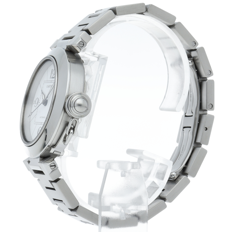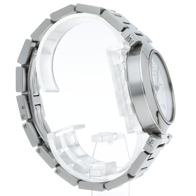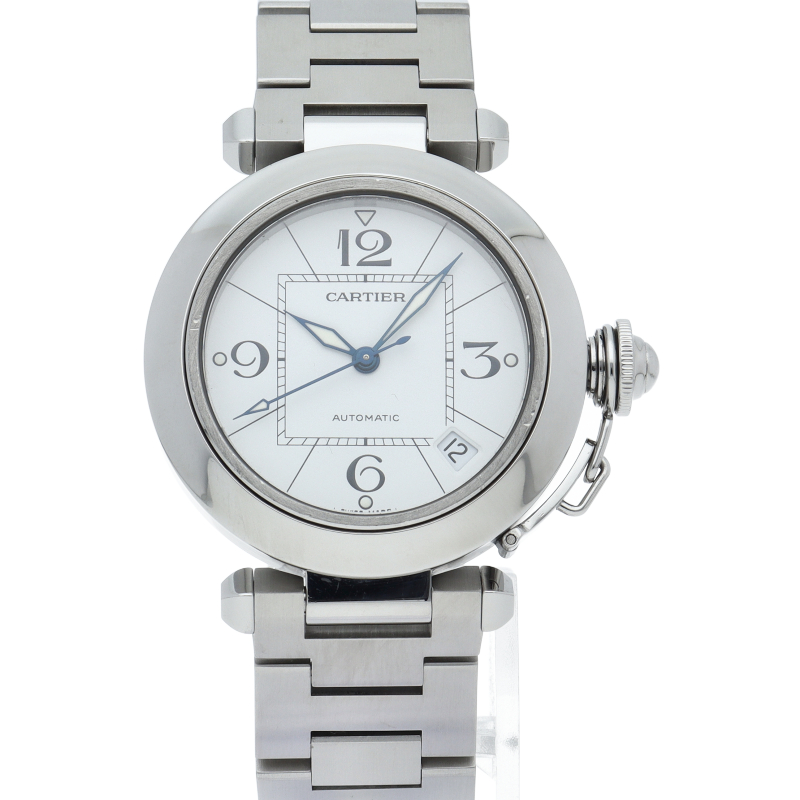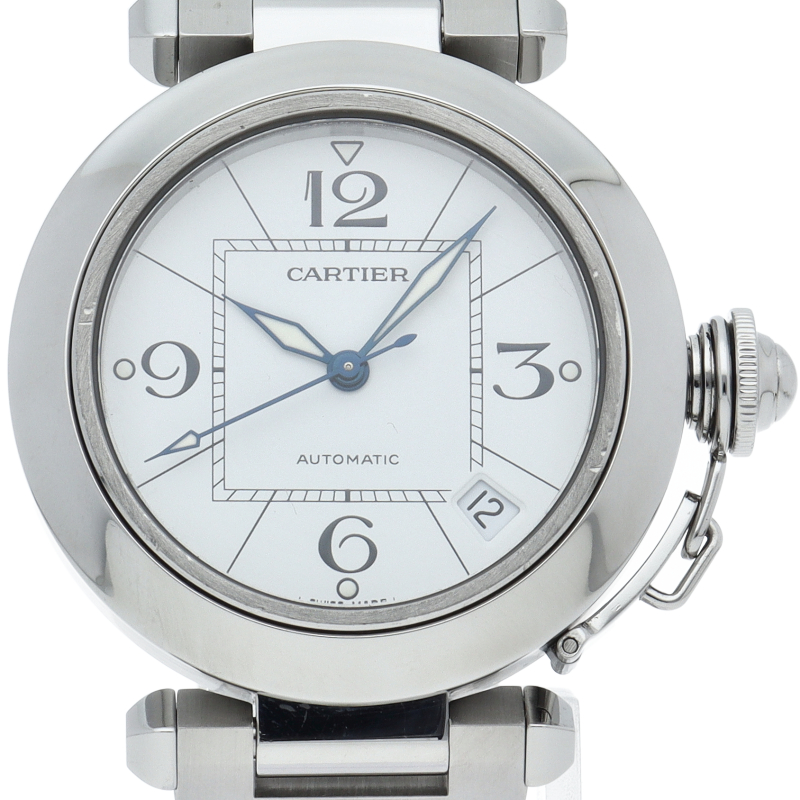カルティエの人気パシャCシリーズ。4時と5時の間にデイト表示機能が付いた実用性のある1本。どんなシーンにも活用できるラウンドケースがオシャレです。
