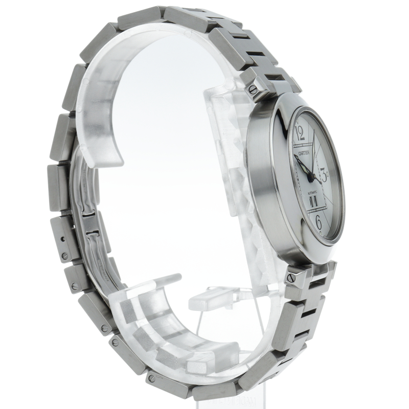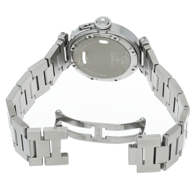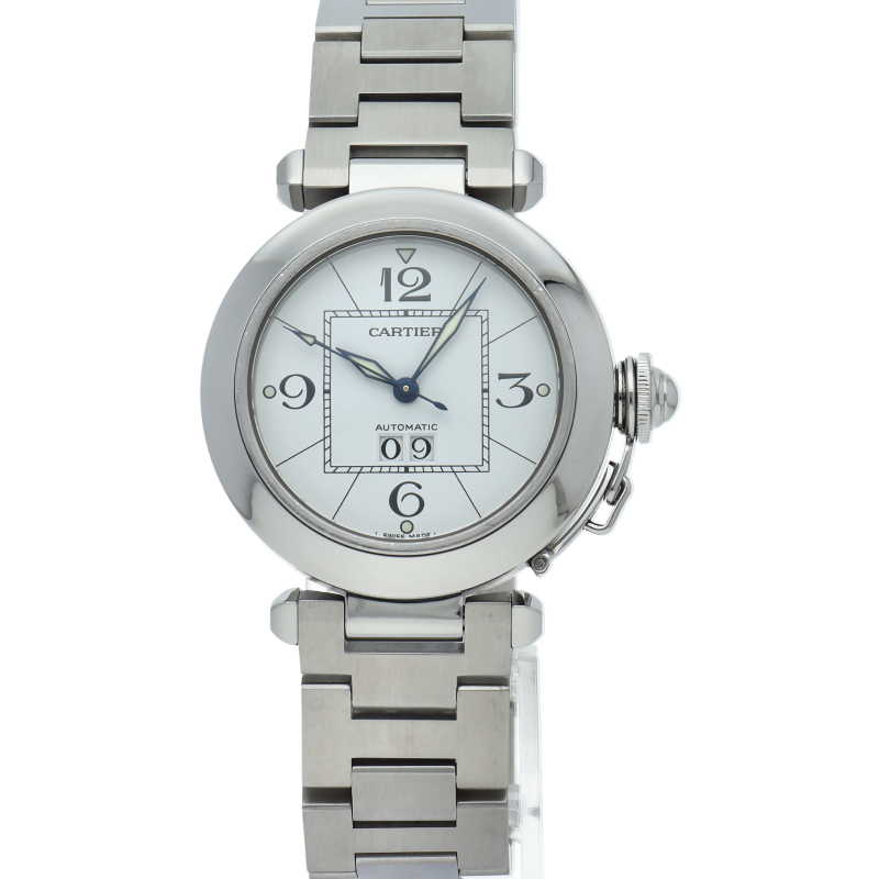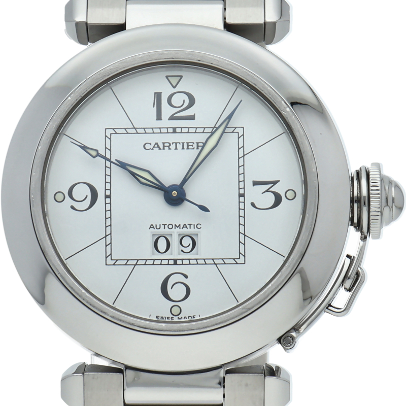 カルティエの人気「パシャC」シリーズ。大きい日付表示が特徴的なビッグデイト。視認性も良くどんなシーンにも活用できるラウンドケースがオシャレな1本。