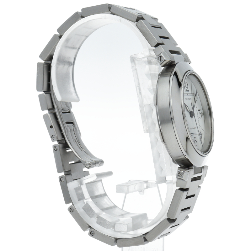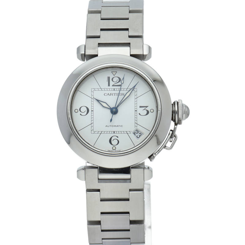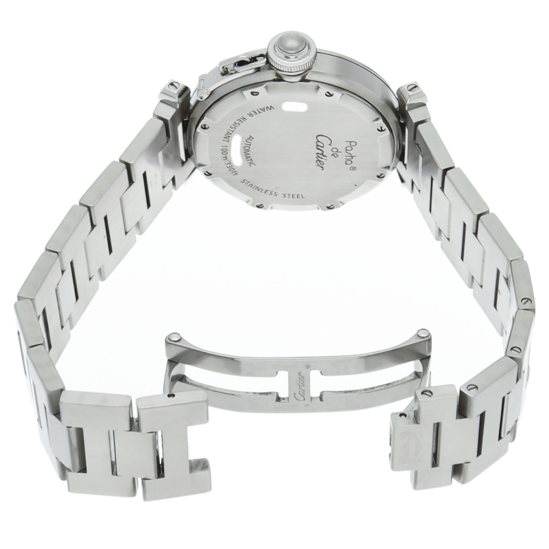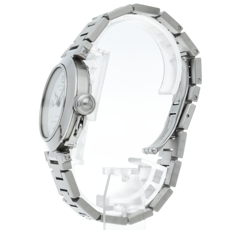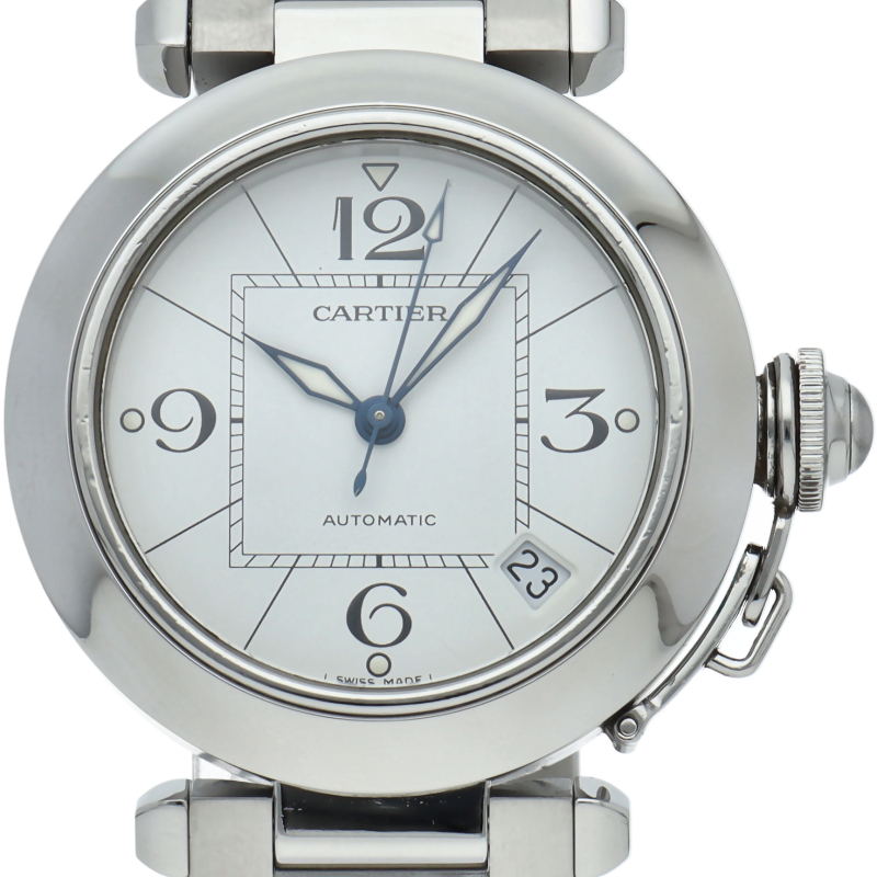 カルティエの人気パシャCシリーズ。4時と5時の間にデイト表示機能が付いた実用性のある1本。どんなシーンにも活用できるラウンドケースがオシャレです。