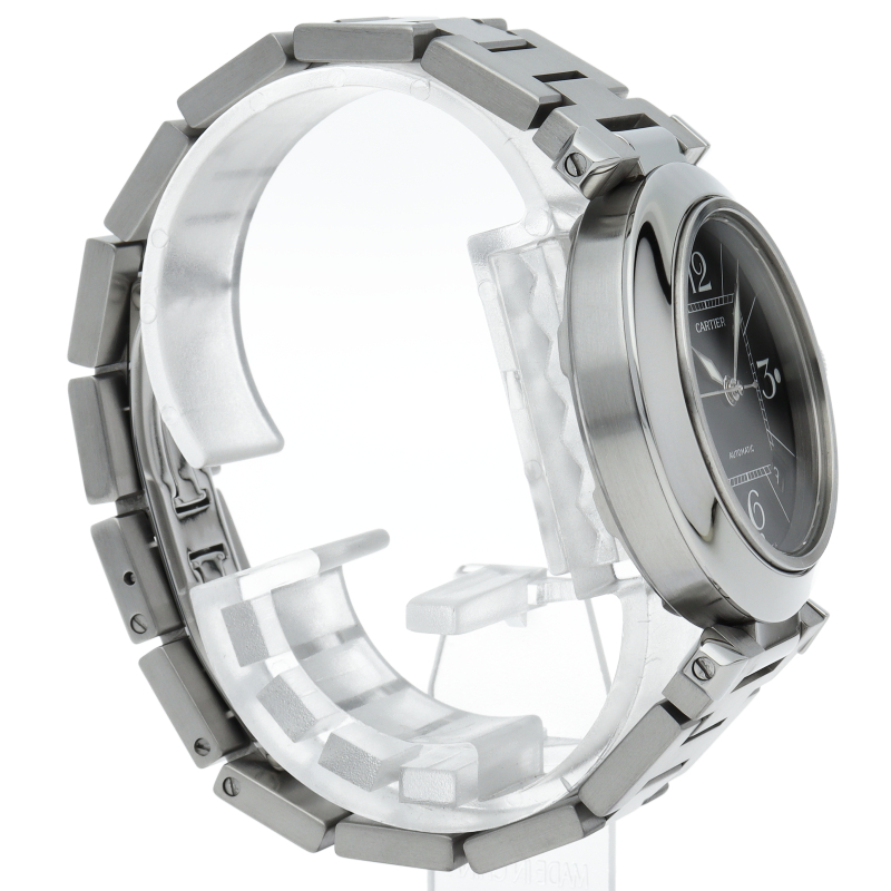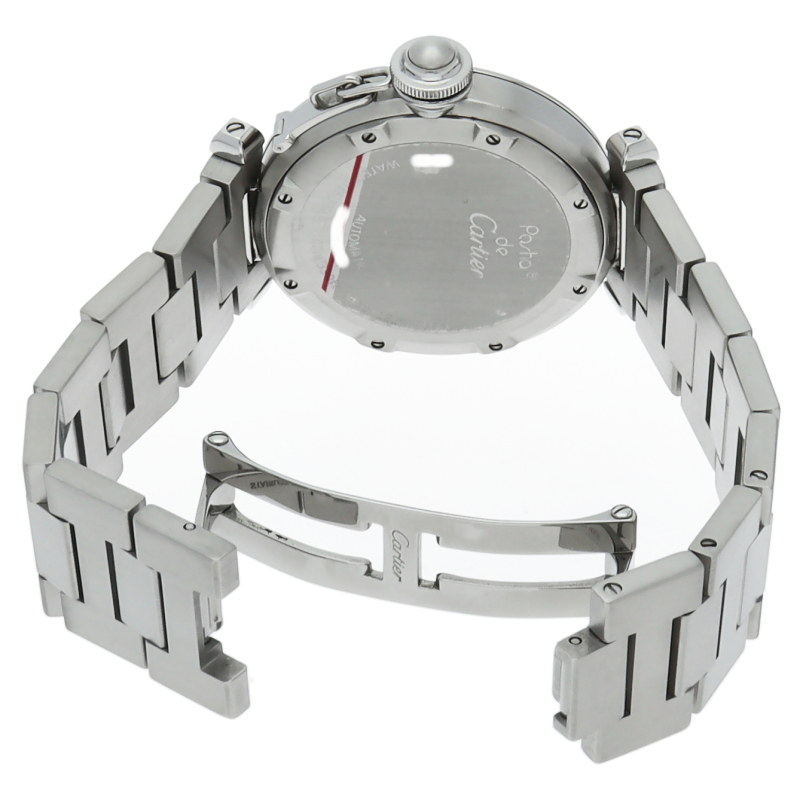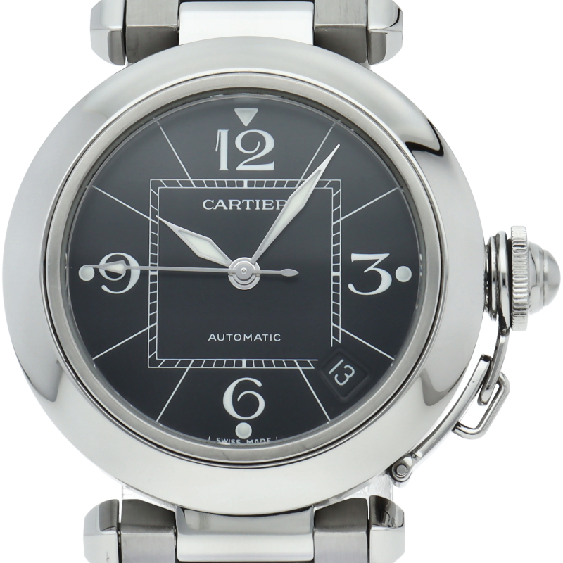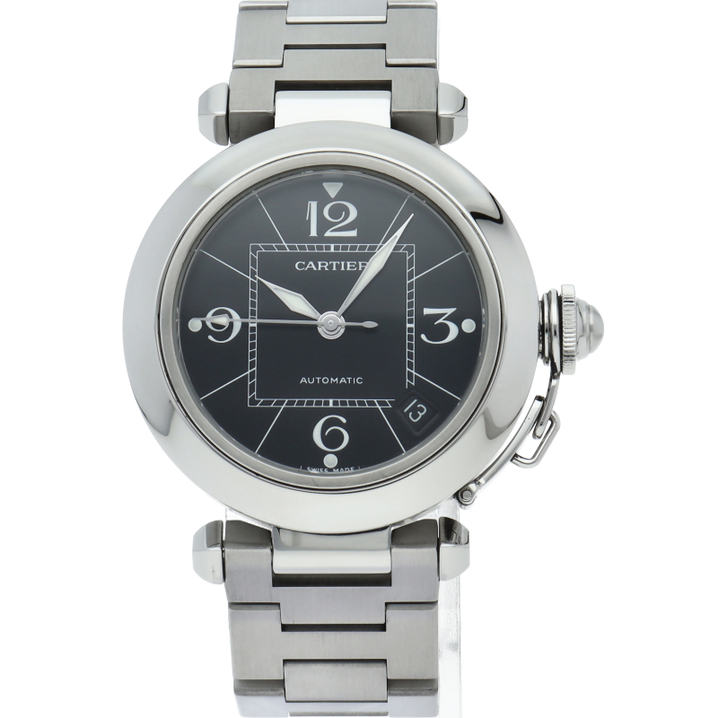 カルティエの人気パシャCシリーズ。4時と5時の間にデイト表示機能が付いた実用性のある1本。どんなシーンにも活用できるラウンドケースがオシャレです。