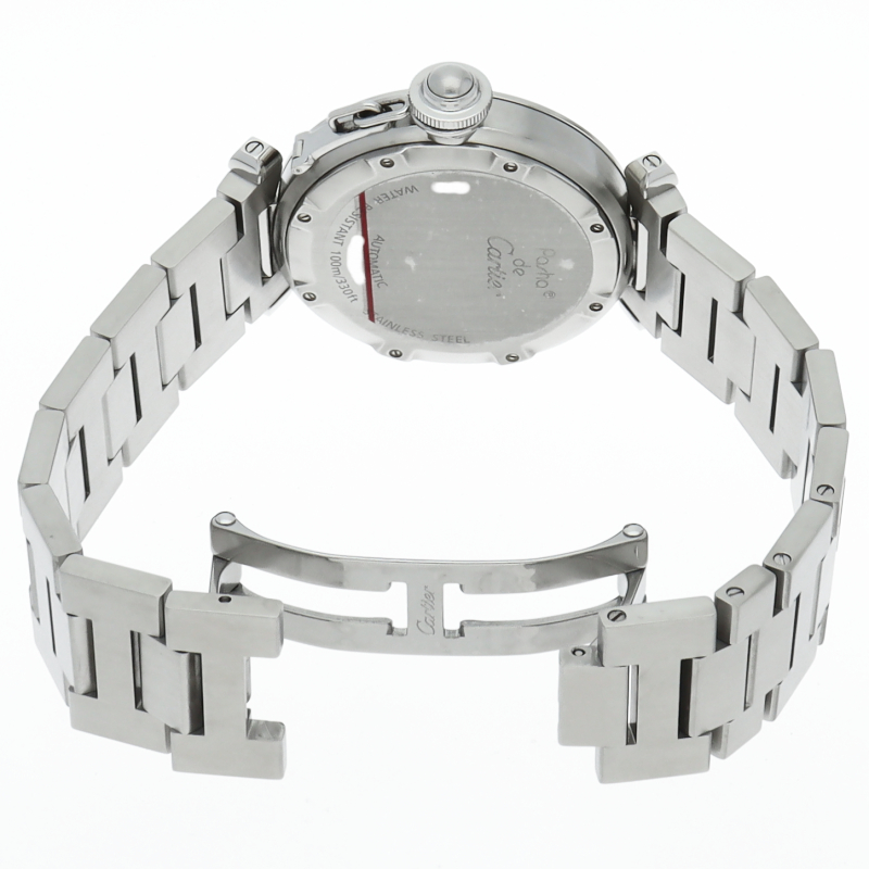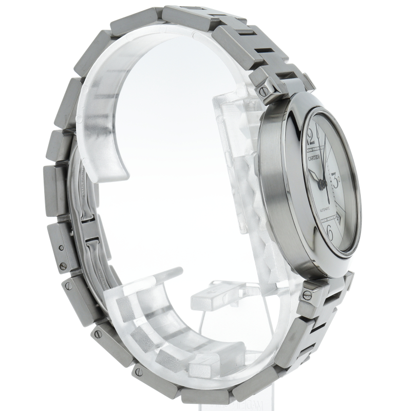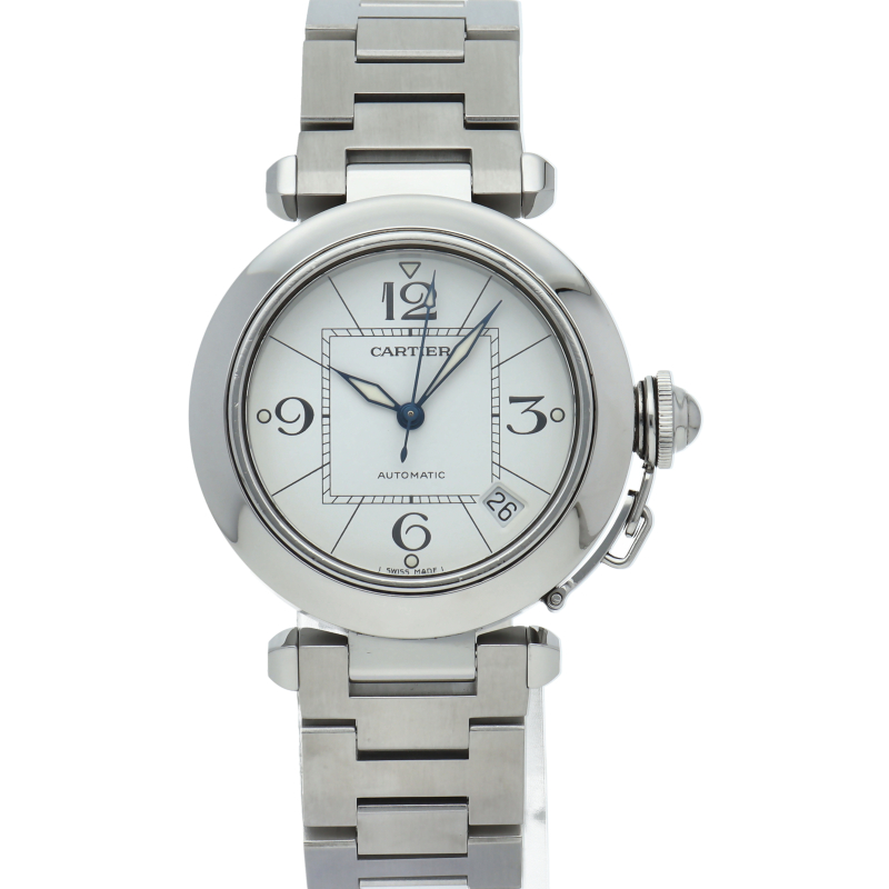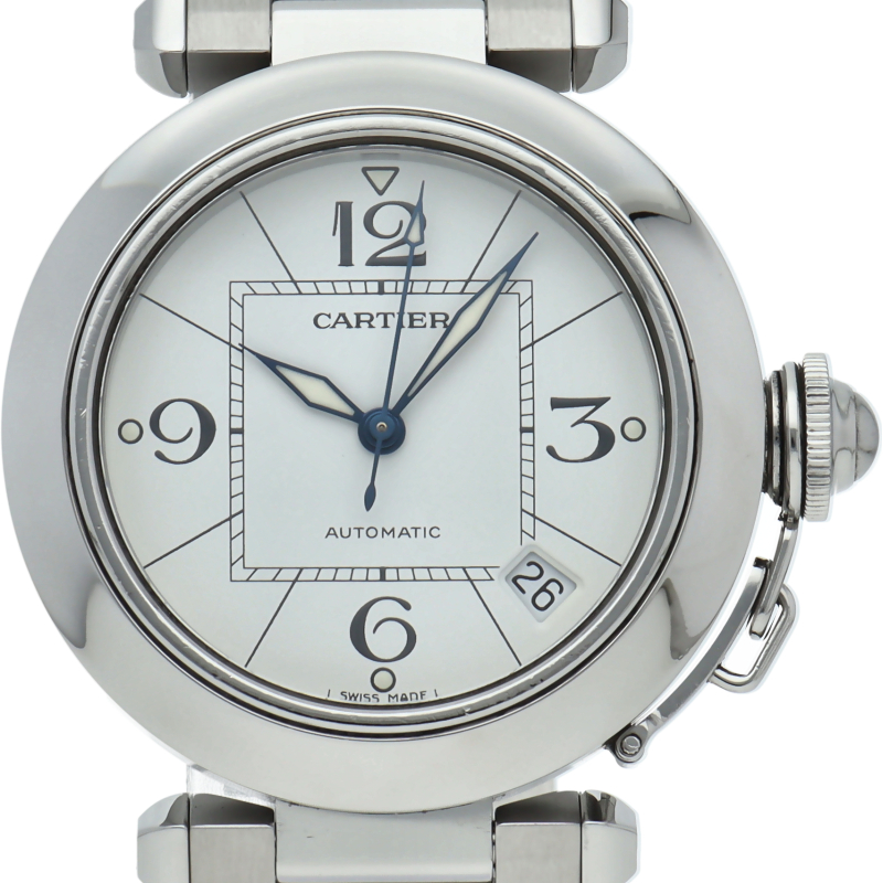 カルティエの人気パシャCシリーズ。4時と5時の間にデイト表示機能が付いた実用性のある1本。どんなシーンにも活用できるラウンドケースがオシャレです。