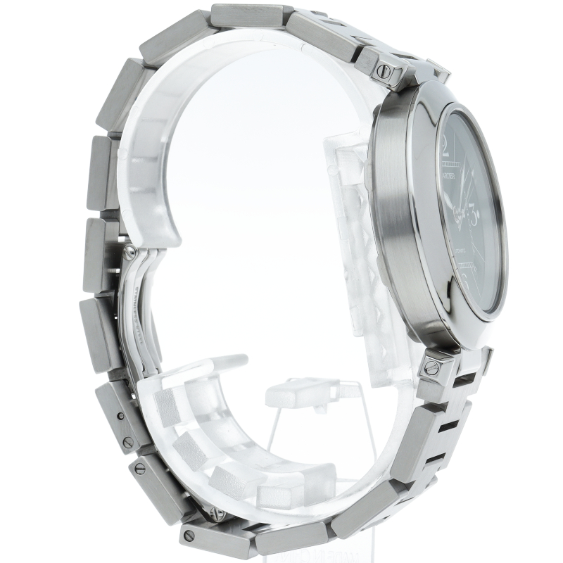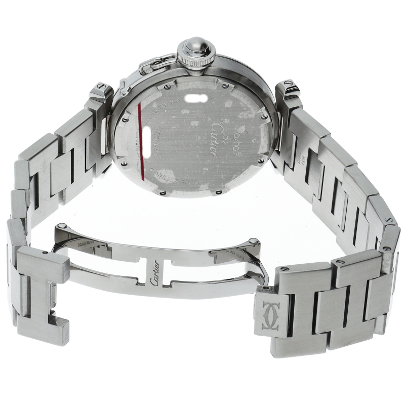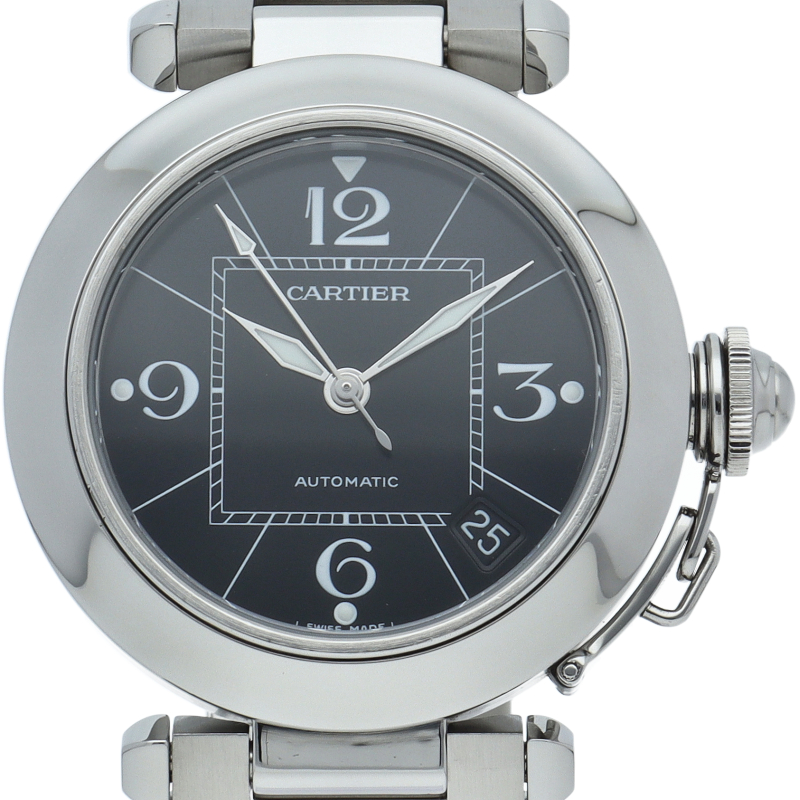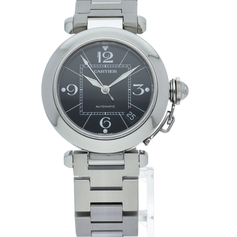 カルティエの人気パシャCシリーズ。4時と5時の間にデイト表示機能が付いた実用性のある1本。どんなシーンにも活用できるラウンドケースがオシャレです。
