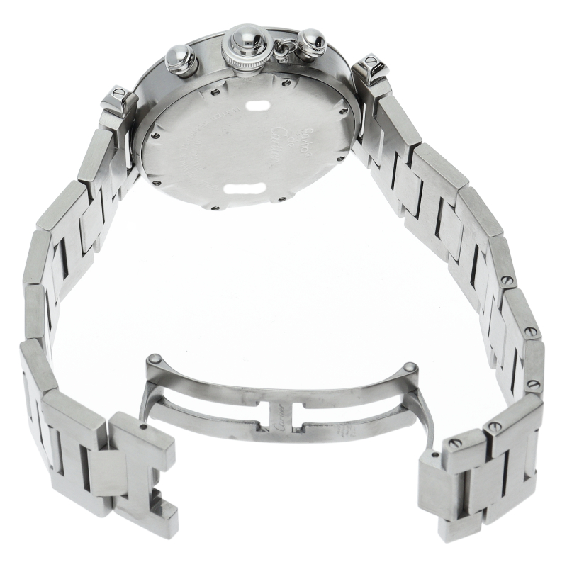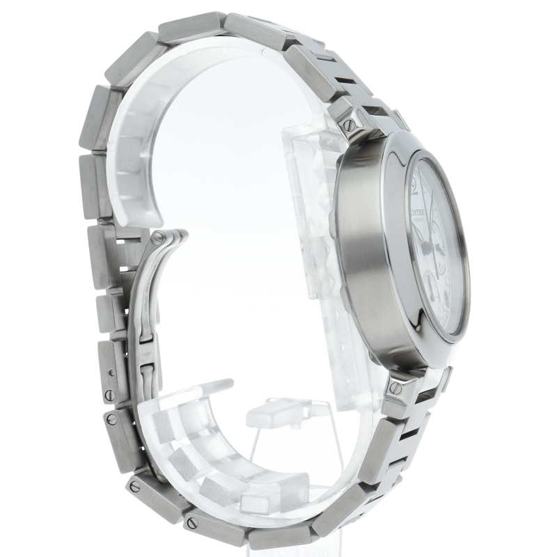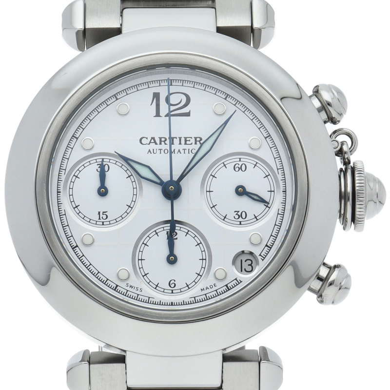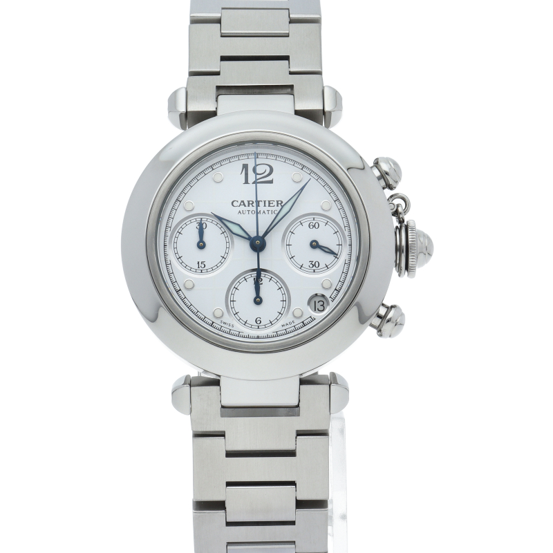カルティエの人気「パシャC」シリーズ。クロノグラフを搭載したモデルでホワイトの文字盤が爽やかな印象を与えるお洒落な時計です。