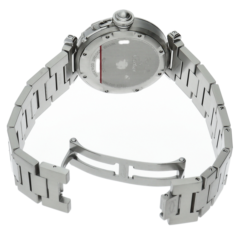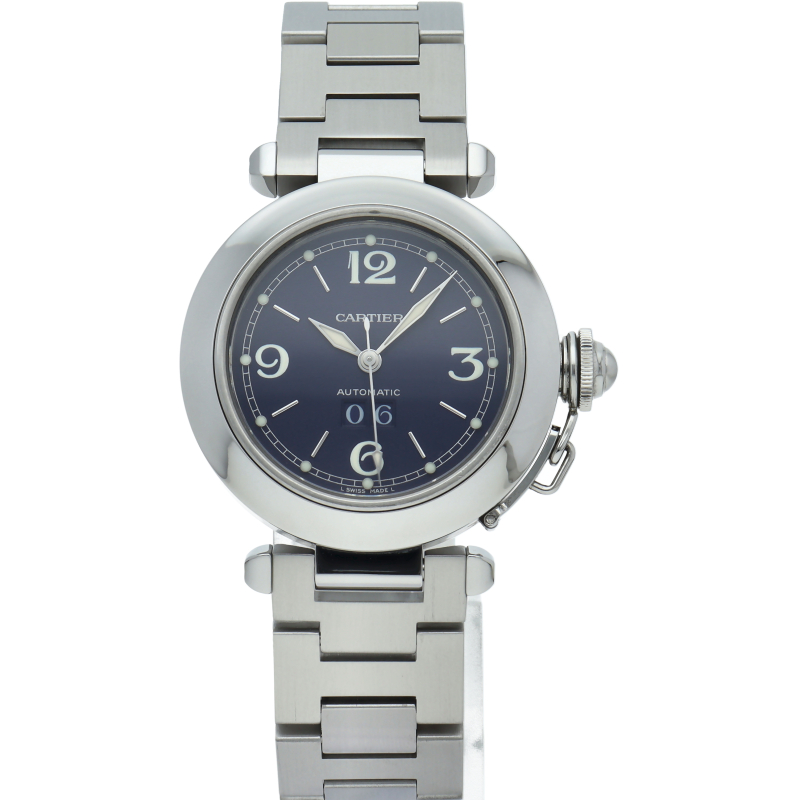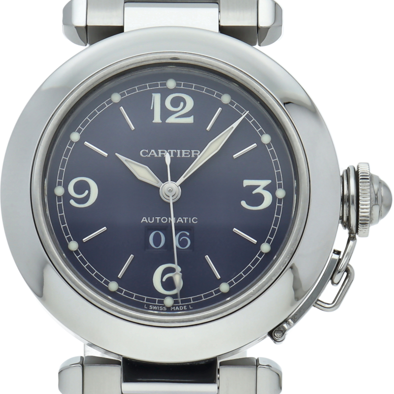 カルティエの人気シリーズ「パシャC」。大きい日付表示が特徴的なビッグデイト。視認性も良くどんなシーンにも活用できるラウンドケースがオシャレな1本。ネイビー文字盤がオシャレな一本です。