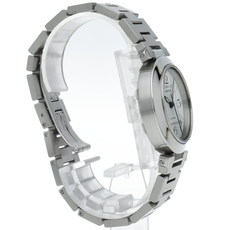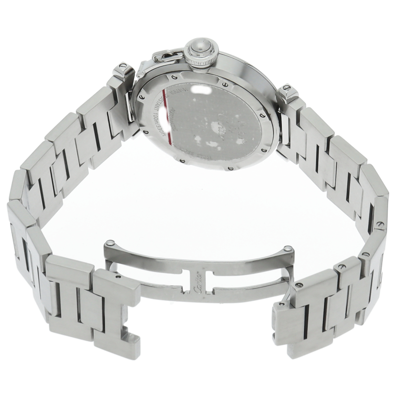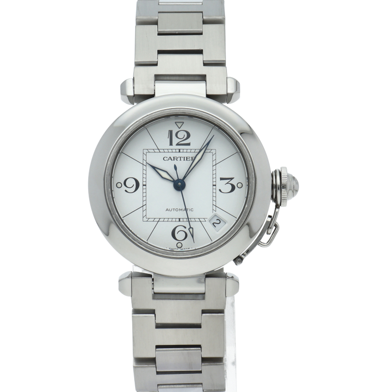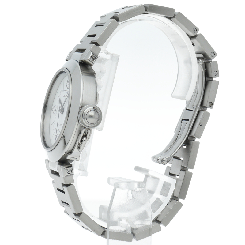 カルティエの人気パシャCシリーズ。4時と5時の間にデイト表示機能が付いた実用性のある1本。どんなシーンにも活用できるラウンドケースがオシャレです。