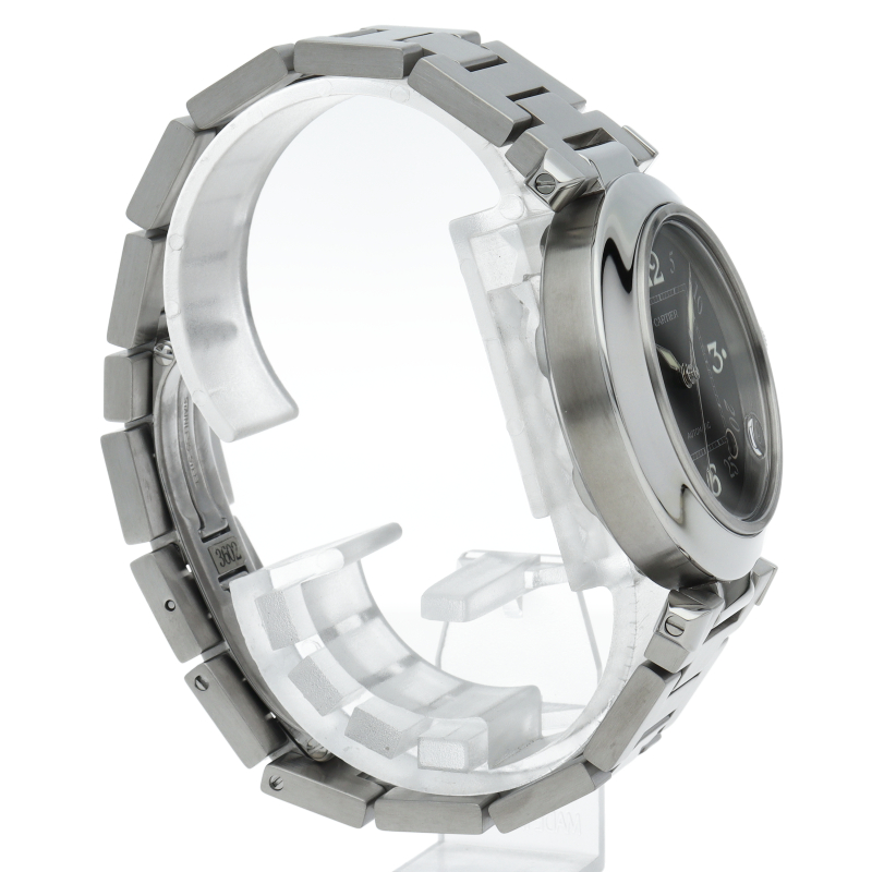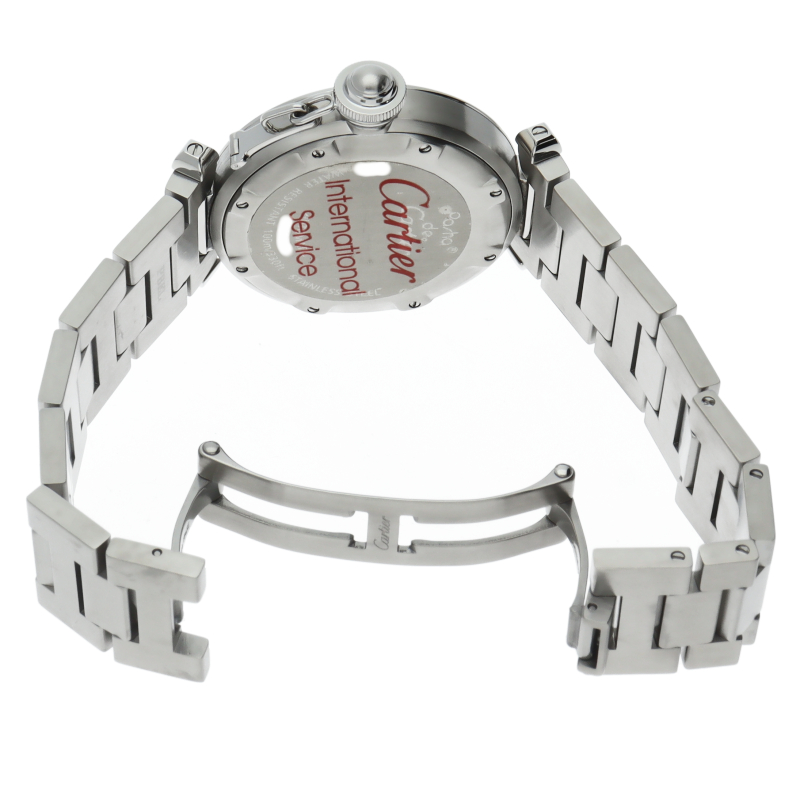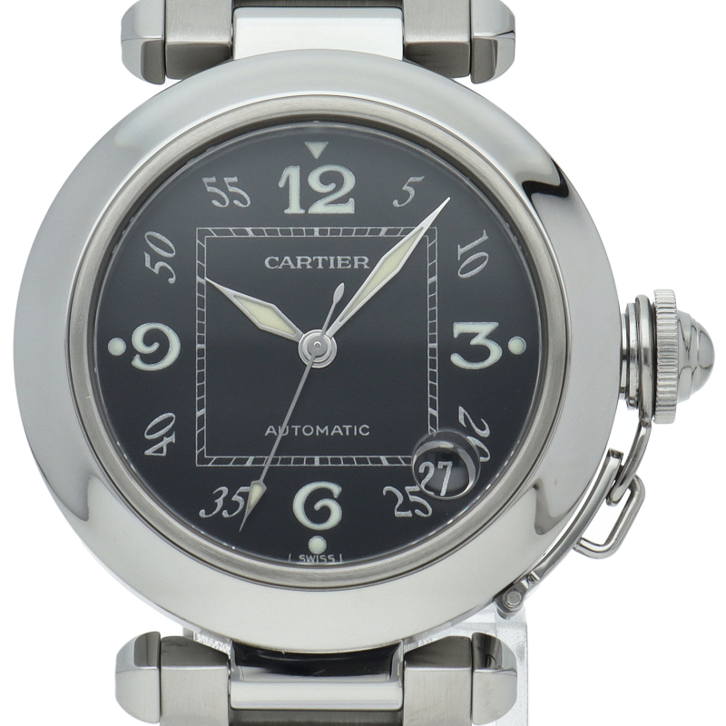 カルティエの人気パシャCシリーズ。4時と5時の間にデイト表示機能が付いた実用性のある1本。どんなシーンにも活用できるラウンドケースがオシャレです。