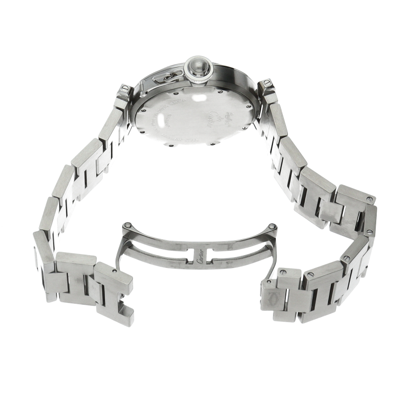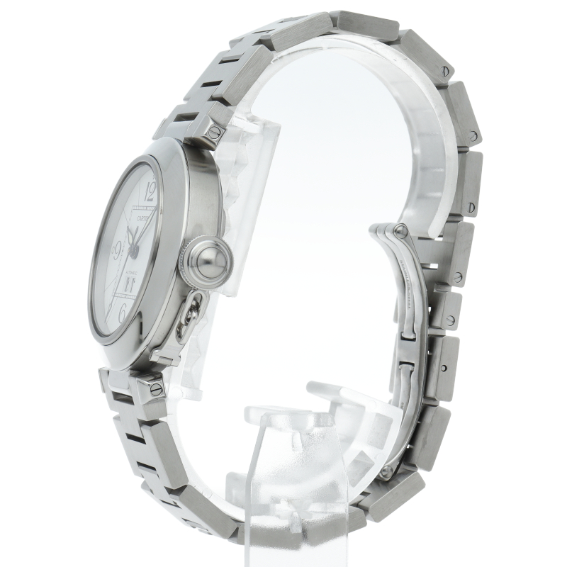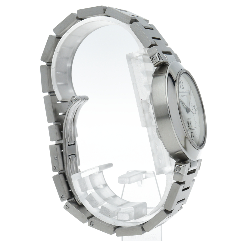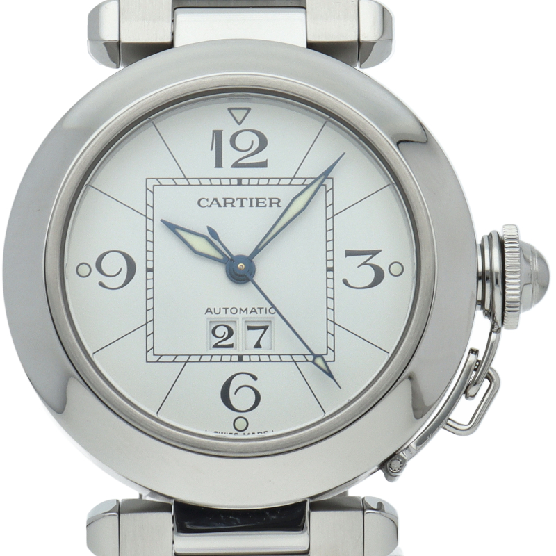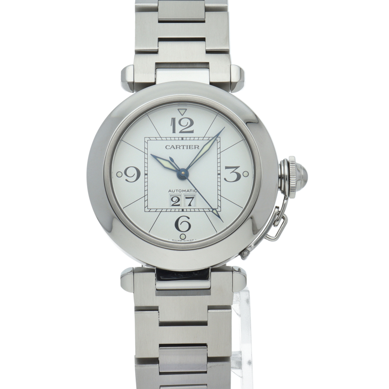 カルティエの人気「パシャC」シリーズ。大きい日付表示が特徴的なビッグデイト。視認性も良くどんなシーンにも活用できるラウンドケースがオシャレな1本。