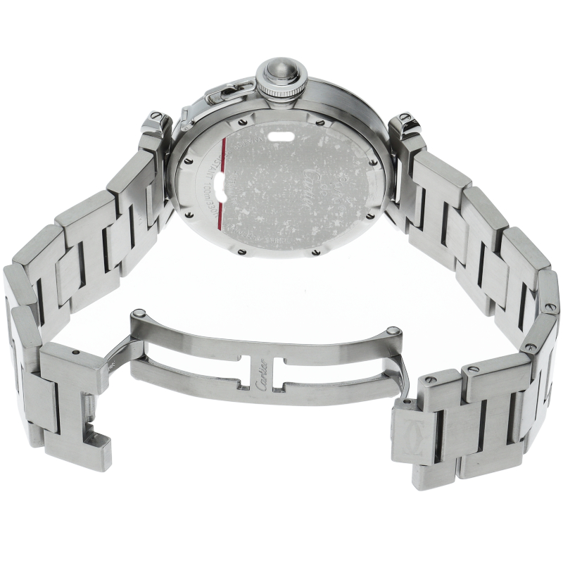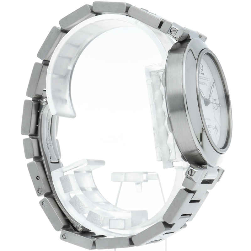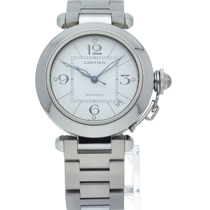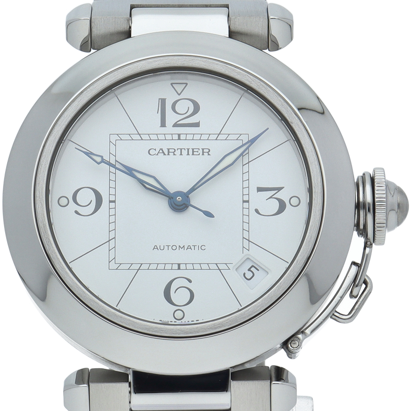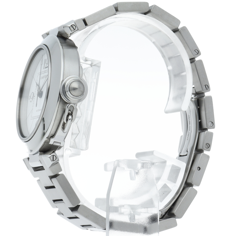 カルティエの人気パシャCシリーズ。4時と5時の間にデイト表示機能が付いた実用性のある1本。どんなシーンにも活用できるラウンドケースがオシャレです。