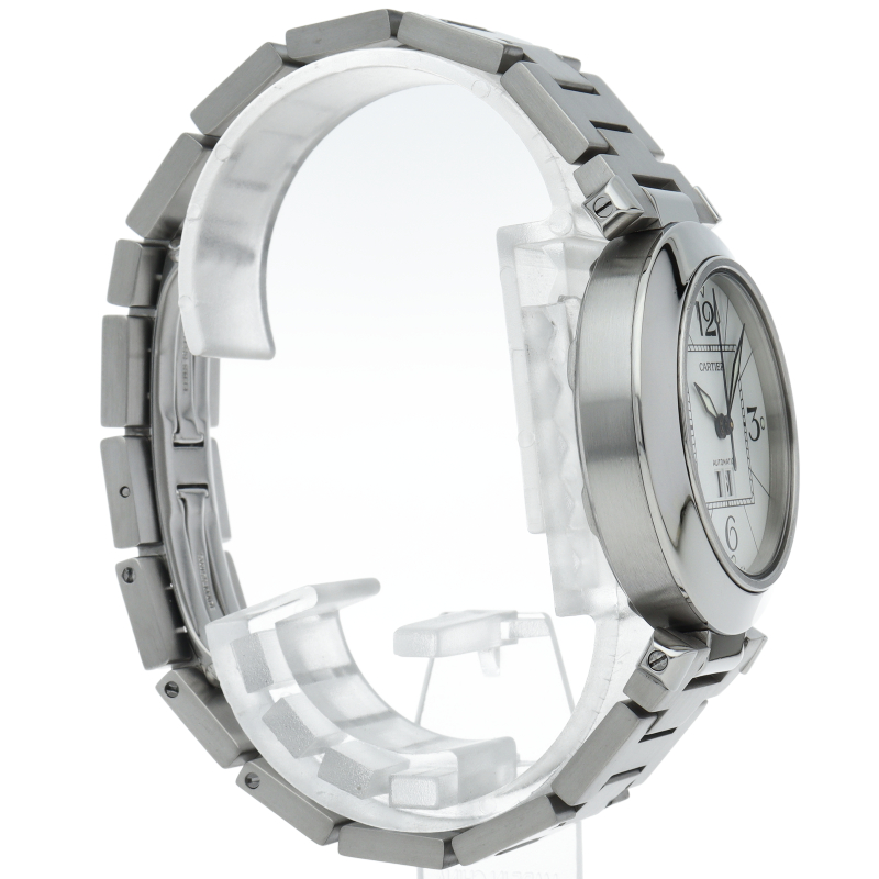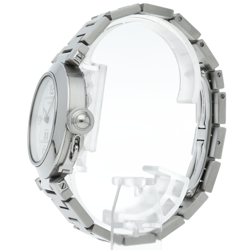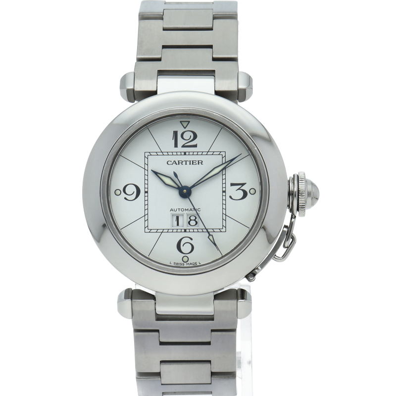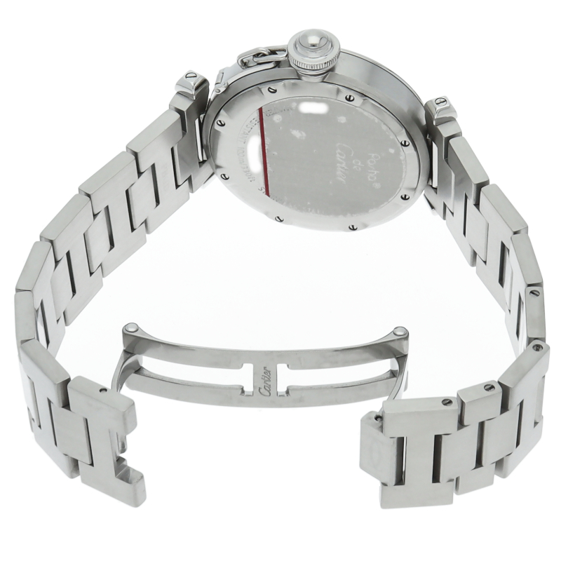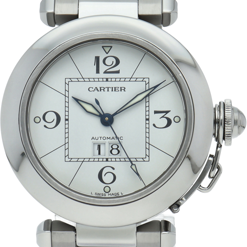カルティエの人気「パシャC」シリーズ。大きい日付表示が特徴的なビッグデイト。視認性も良くどんなシーンにも活用できるラウンドケースがオシャレな1本。
