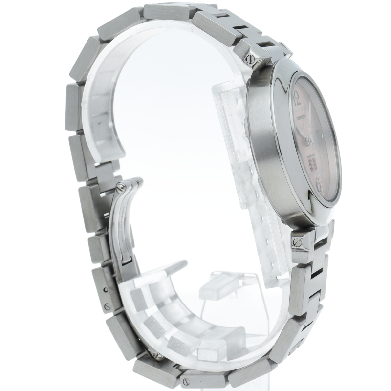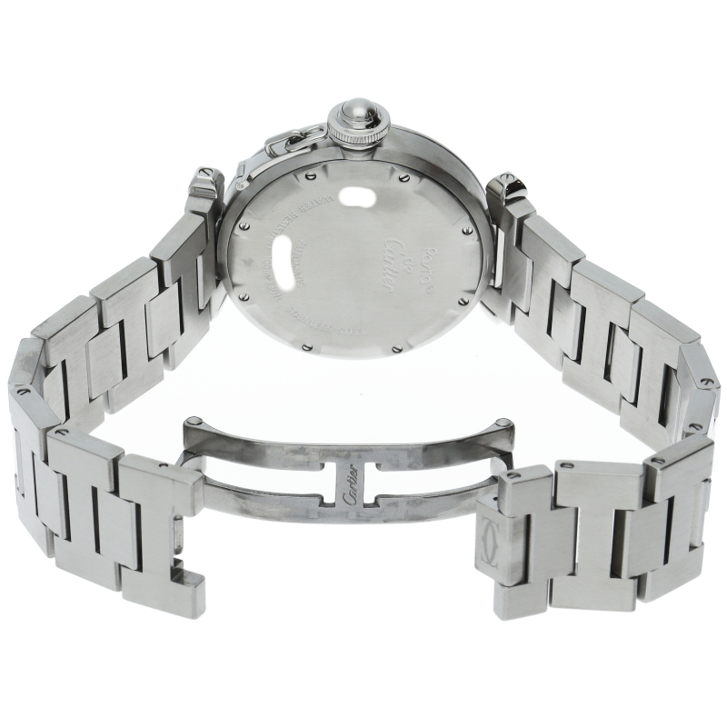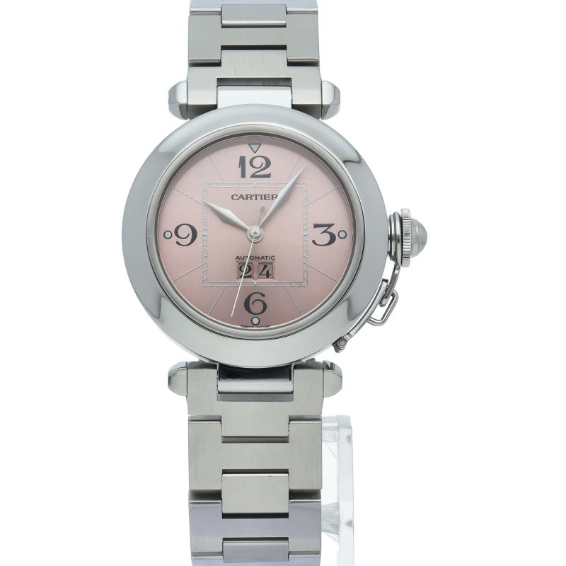 カルティエの人気「パシャC」シリーズ。大きい日付表示が特徴的なビッグデイト。視認性も良くどんなシーンにも活用できるラウンドケースがオシャレな1本。