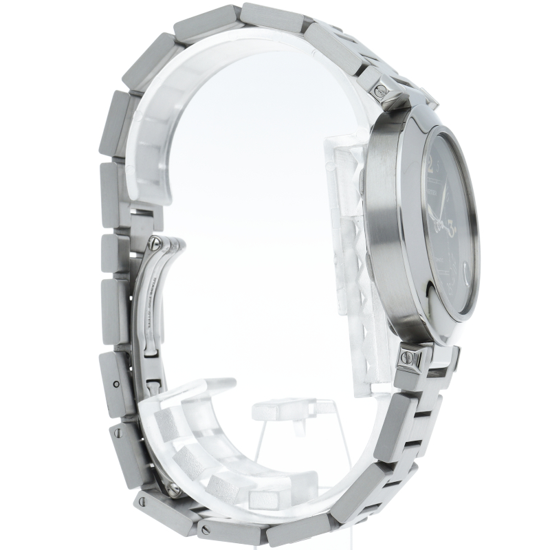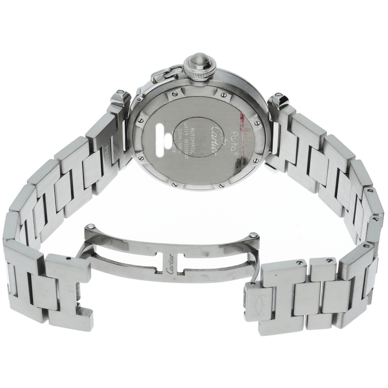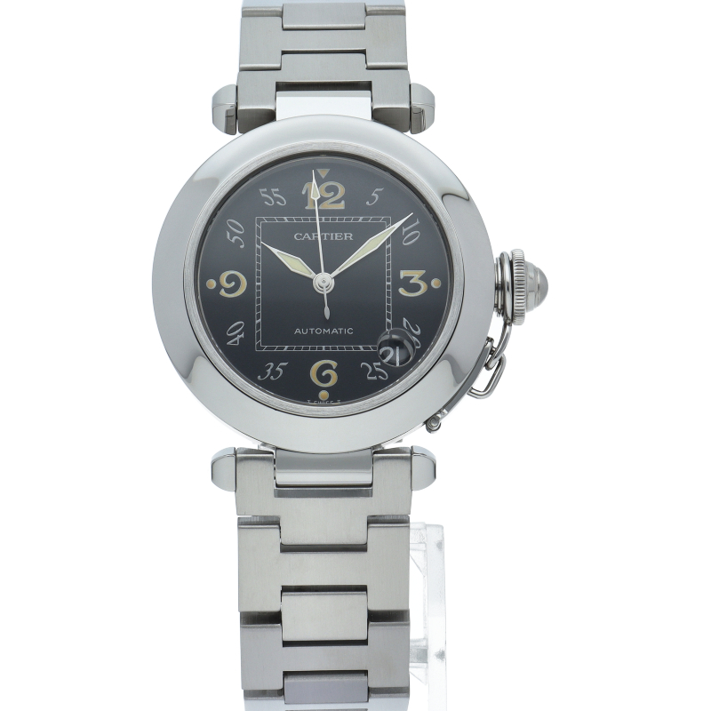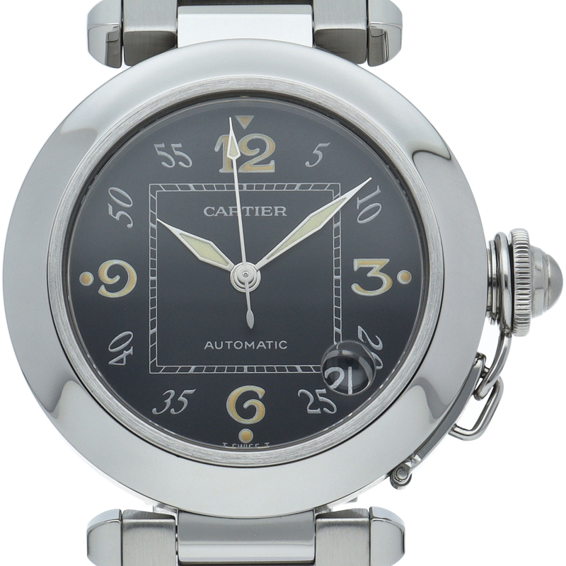 カルティエの人気パシャCシリーズ。4時と5時の間にデイト表示機能が付いた実用性のある1本。どんなシーンにも活用できるラウンドケースがオシャレです。