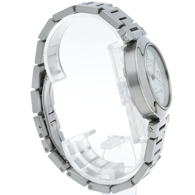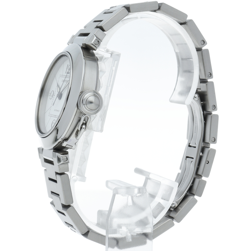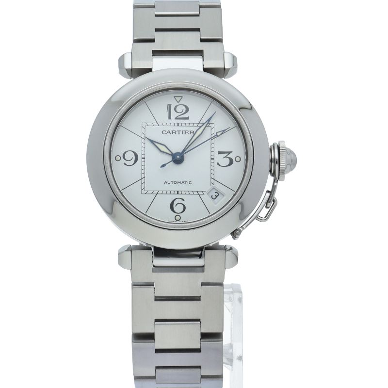 カルティエの人気パシャCシリーズ。4時と5時の間にデイト表示機能が付いた実用性のある1本。どんなシーンにも活用できるラウンドケースがオシャレです。