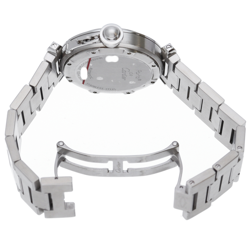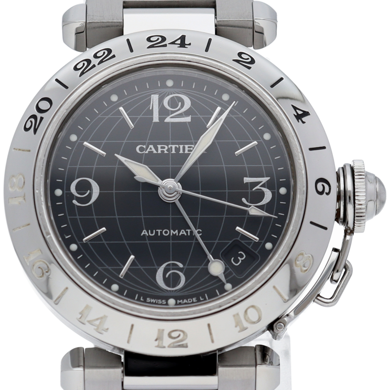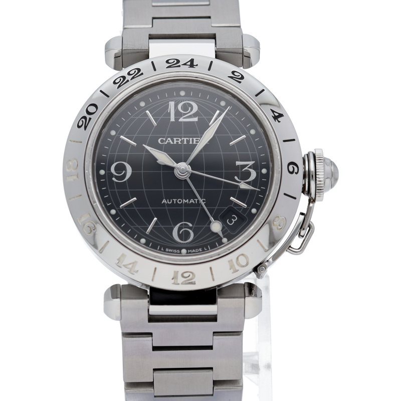 カルティエの人気「パシャC」シリーズ。大きい日付表示が特徴的なビッグデイトにGMT機能が搭載されています。スタイルを選ばずに使用できるオシャレな1本です。