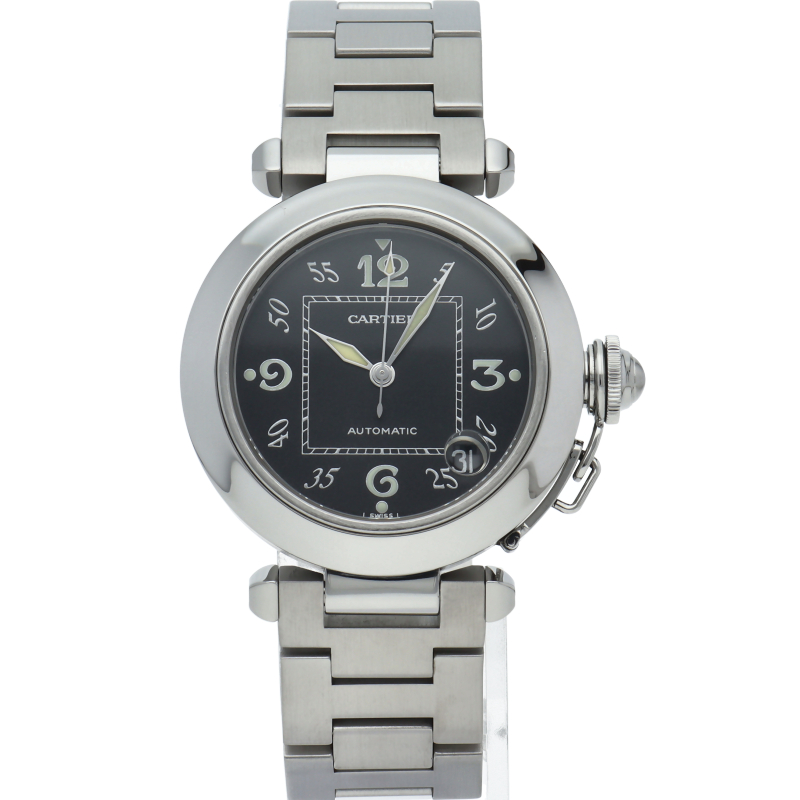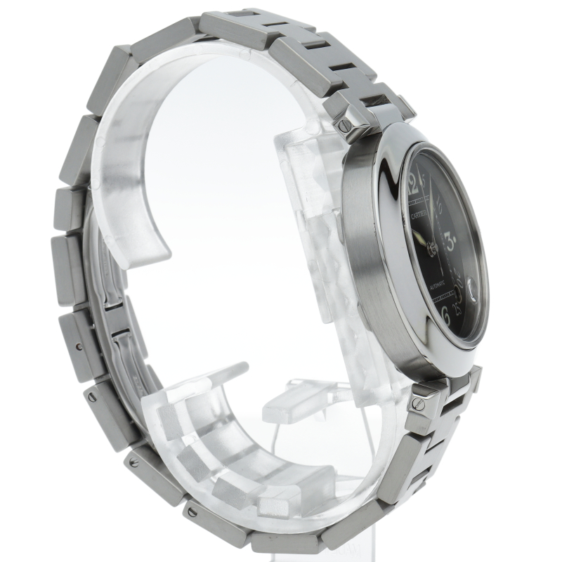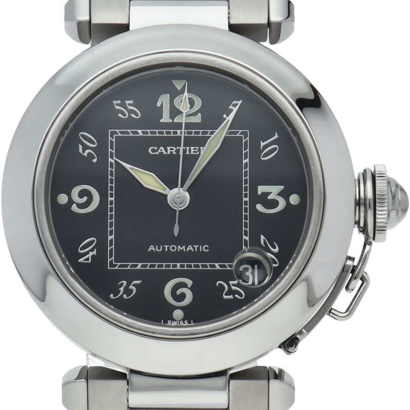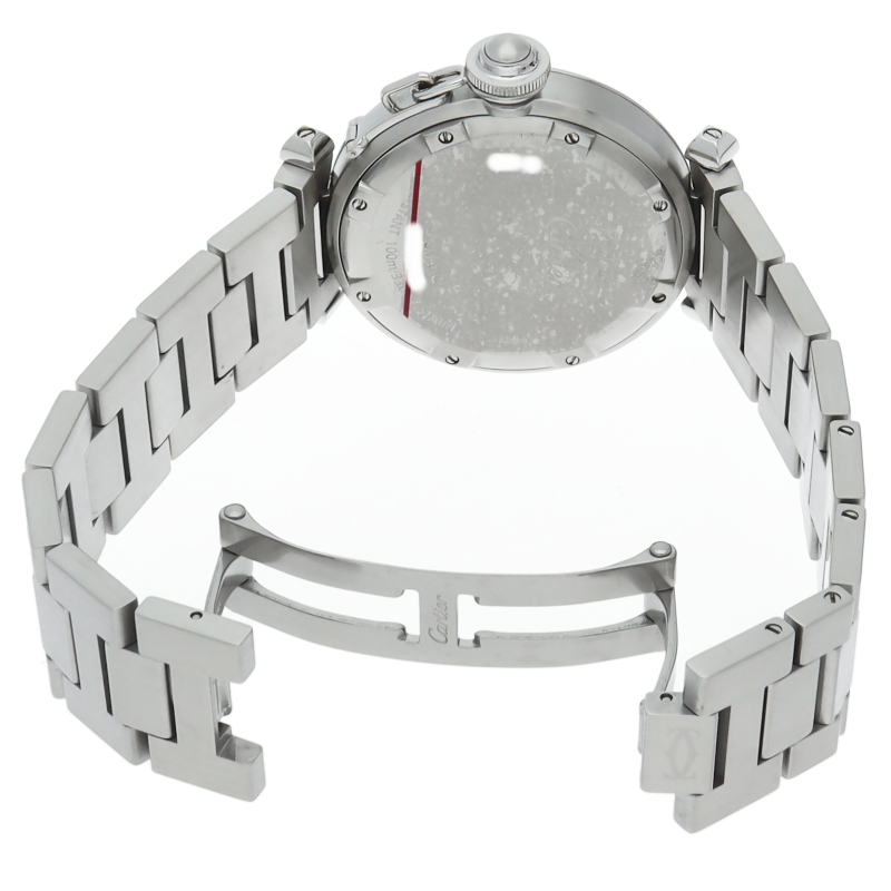 カルティエの人気パシャCシリーズ。4時と5時の間にデイト表示機能が付いた実用性のある1本。どんなシーンにも活用できるラウンドケースがオシャレです。