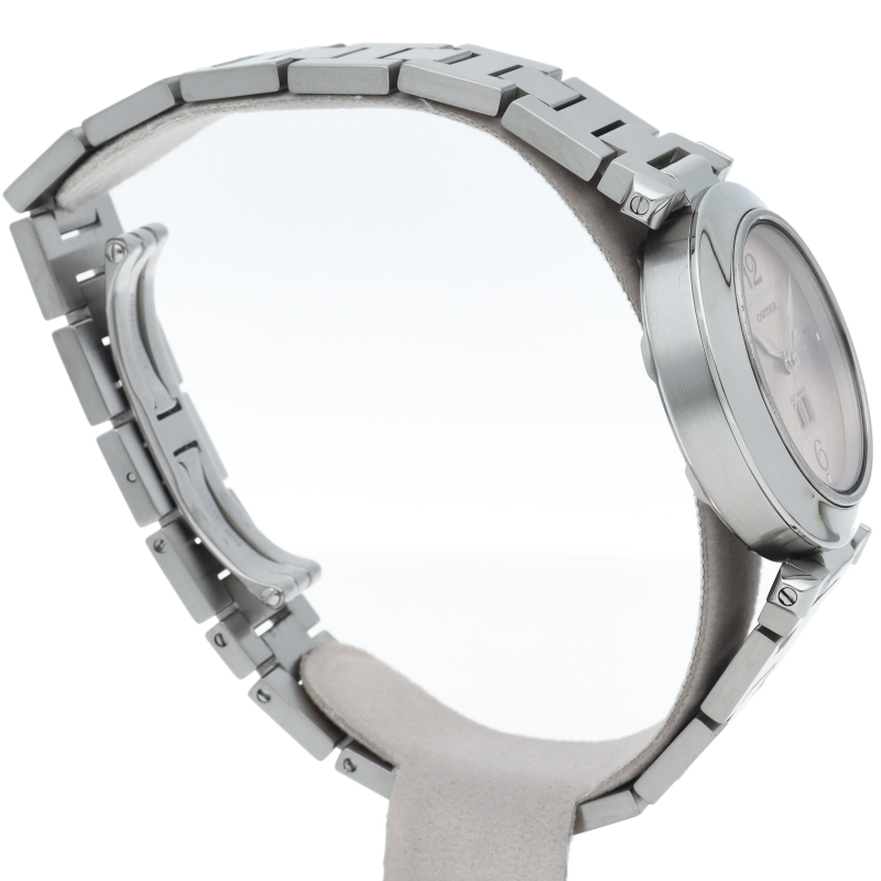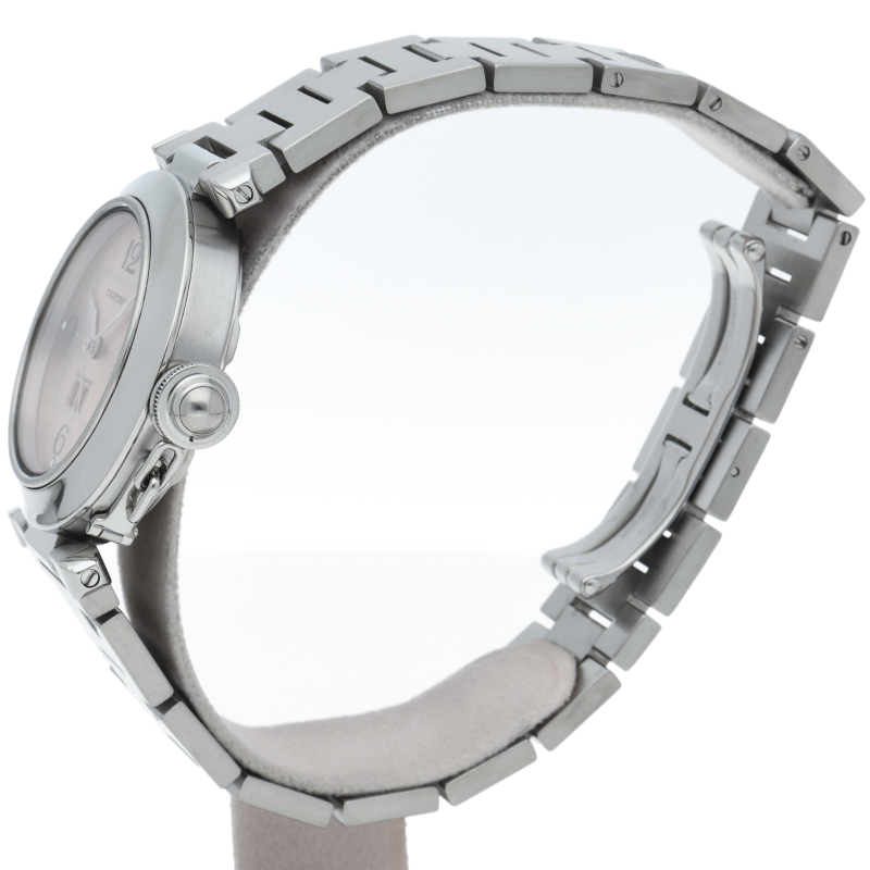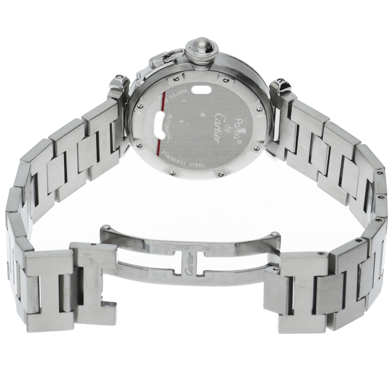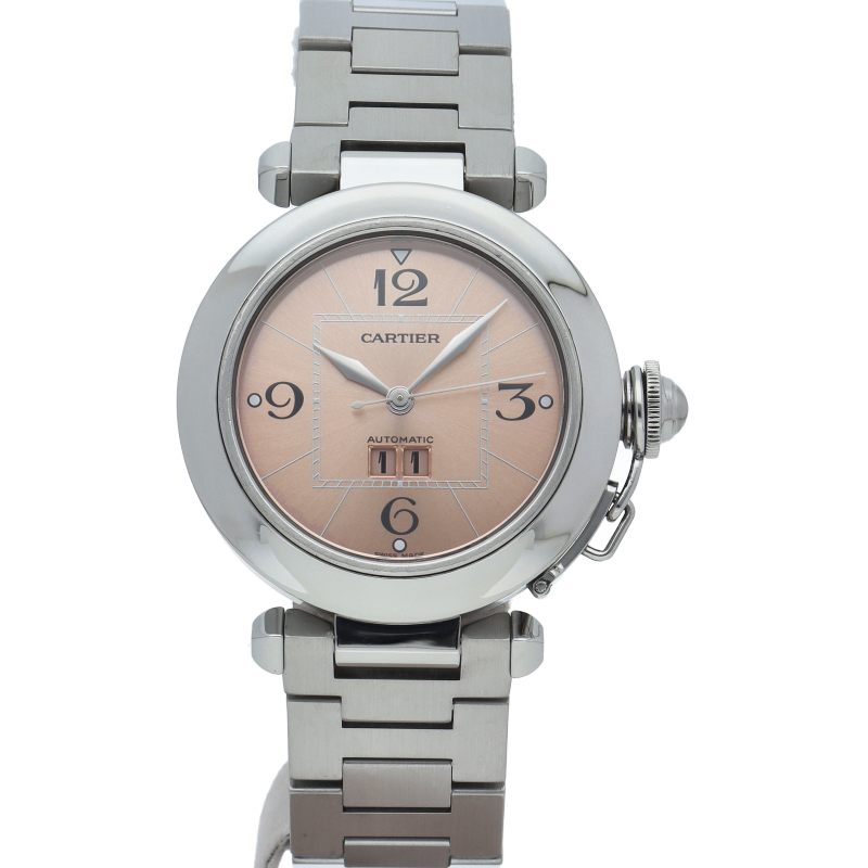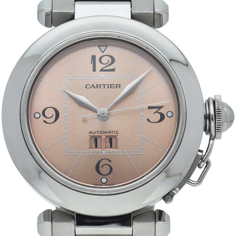カルティエの人気「パシャC」シリーズ。大きい日付表示が特徴的なビッグデイト。視認性も良くどんなシーンにも活用できるラウンドケースがオシャレな1本。