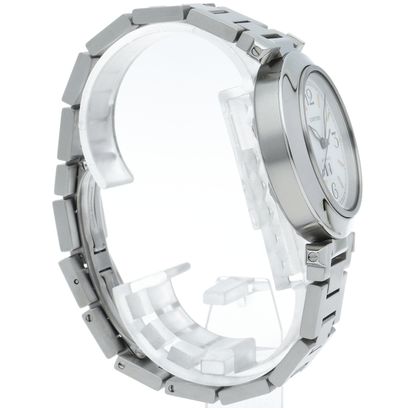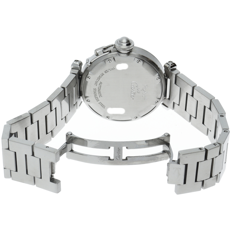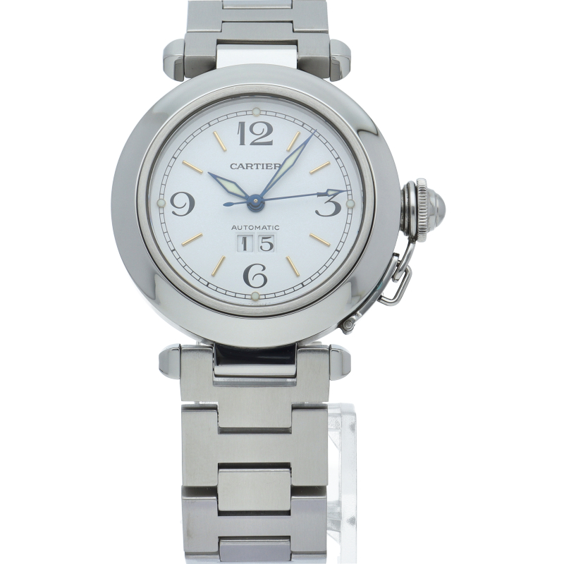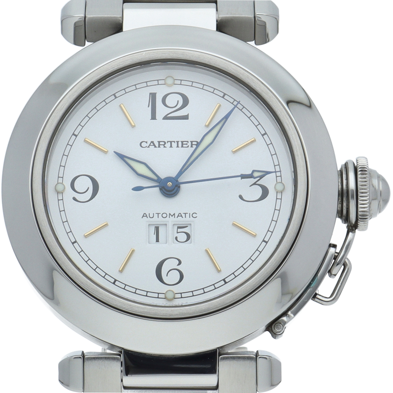 カルティエの人気「パシャC」シリーズ。大きい日付表示が特徴的なビッグデイト。視認性も良くどんなシーンにも活用できるラウンドケースがオシャレな1本。