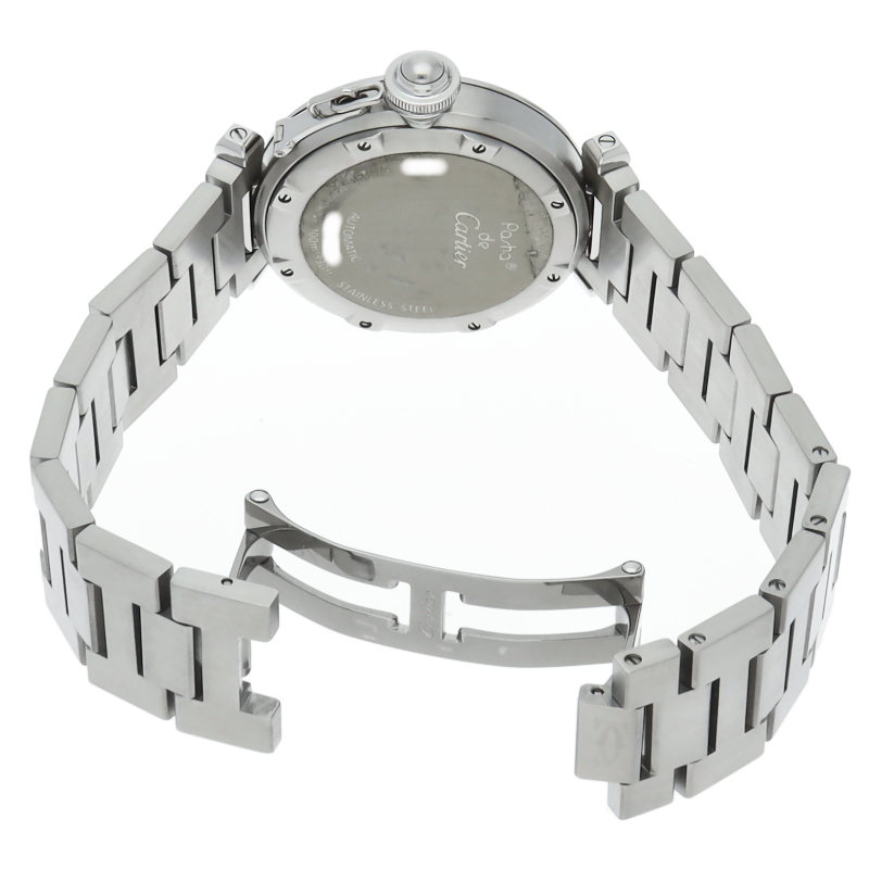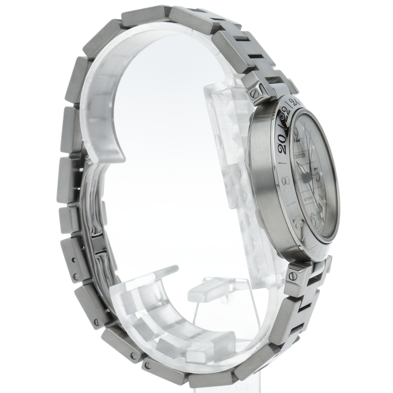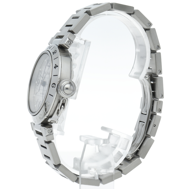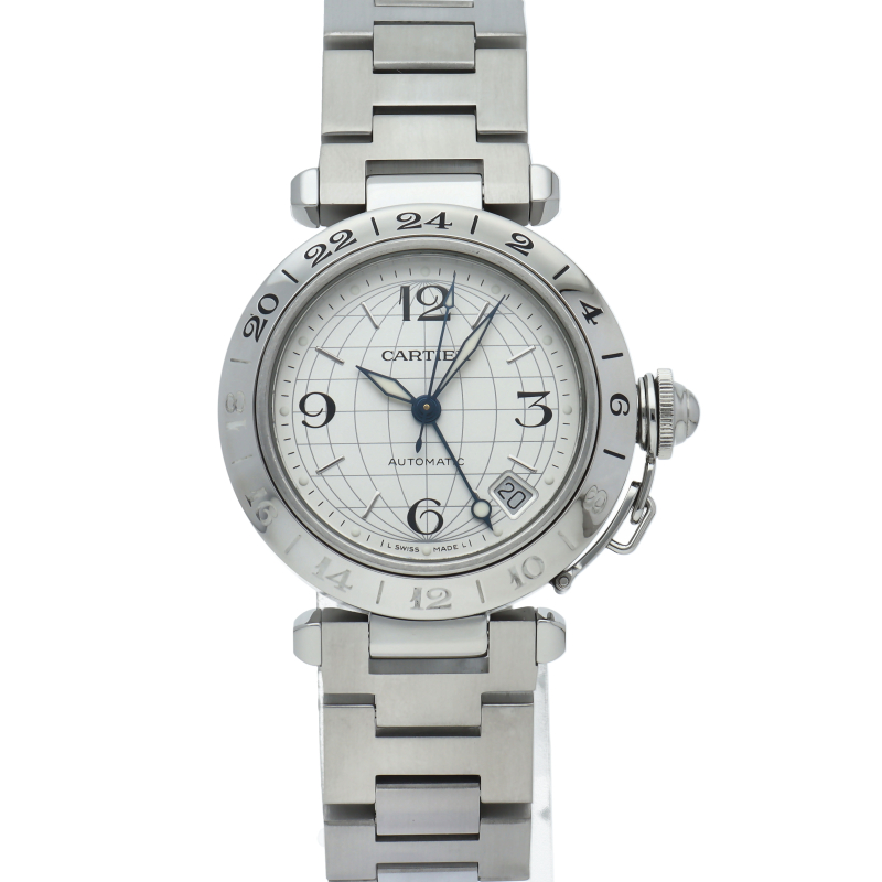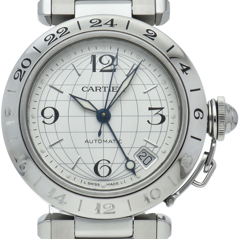 カルティエの人気「パシャC」シリーズ。文字盤に地球儀をモチーフにした放射線状のデザインを持つ、GMT機能搭載モデル。