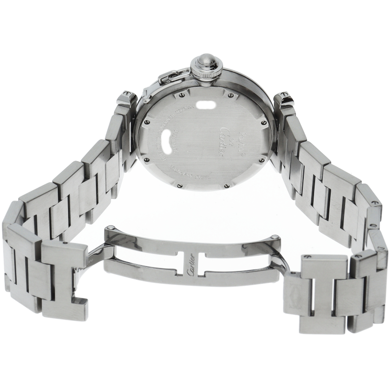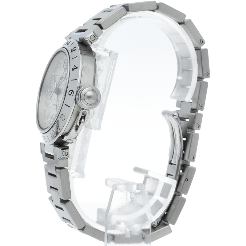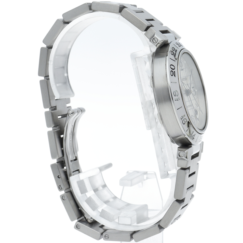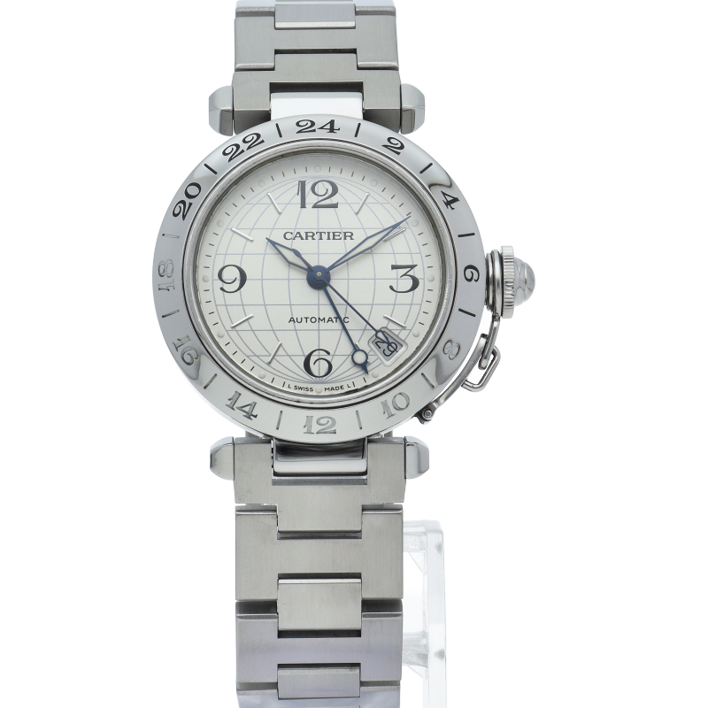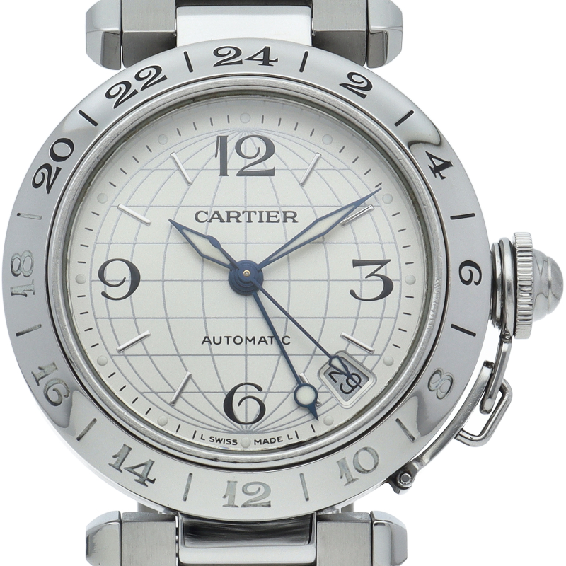 カルティエの人気「パシャC」シリーズ。文字盤に地球儀をモチーフにした放射線状のデザインを持つ、GMT機能搭載モデル。