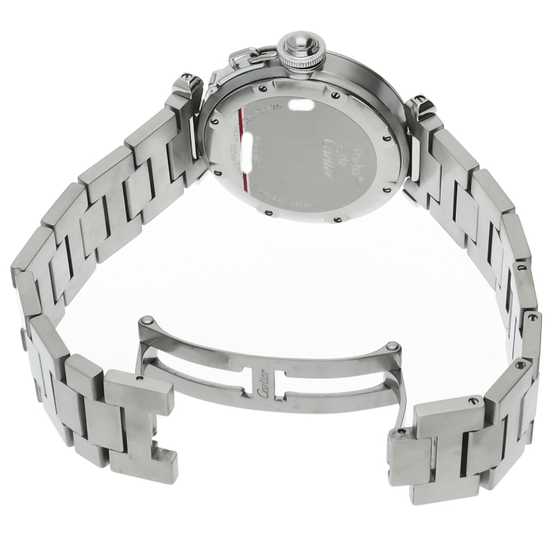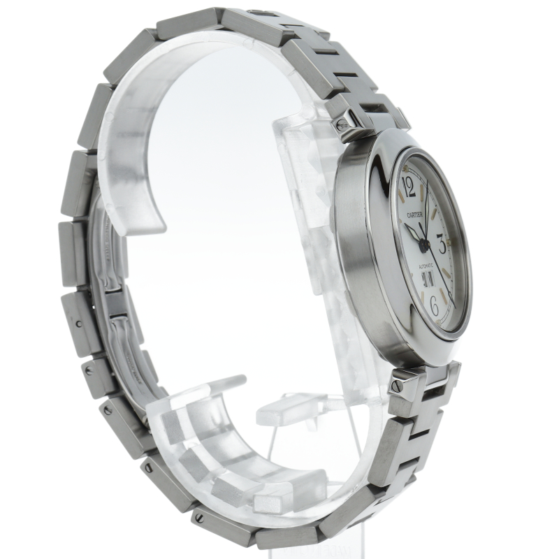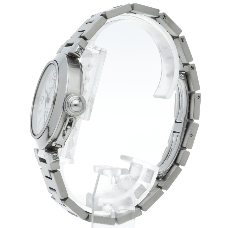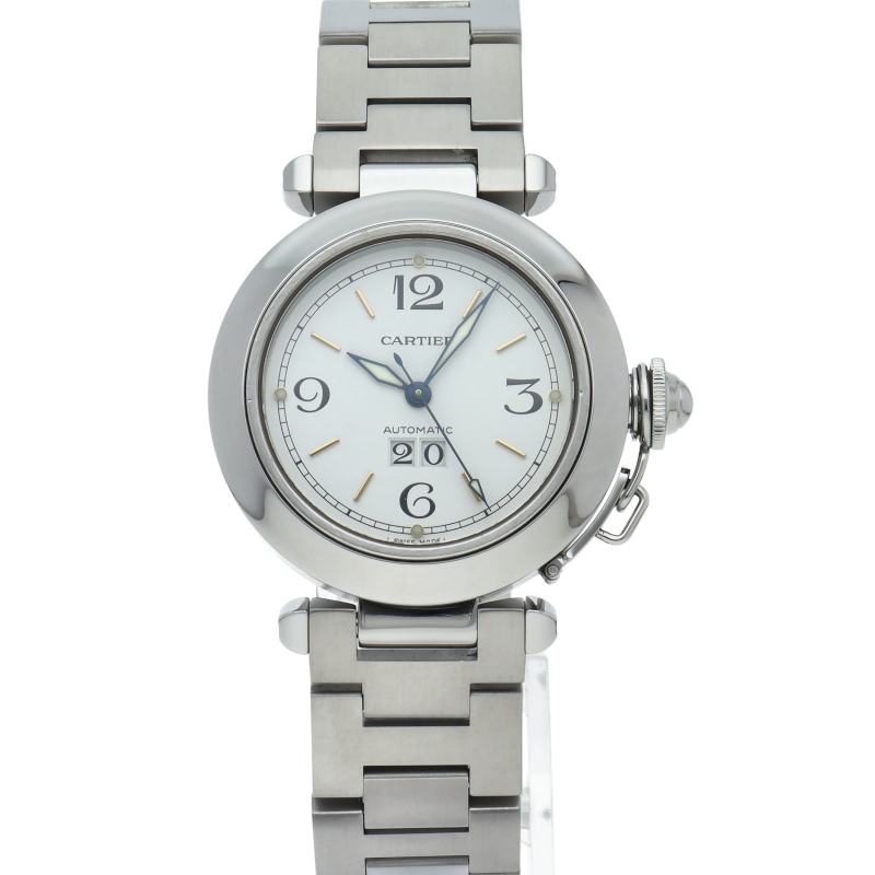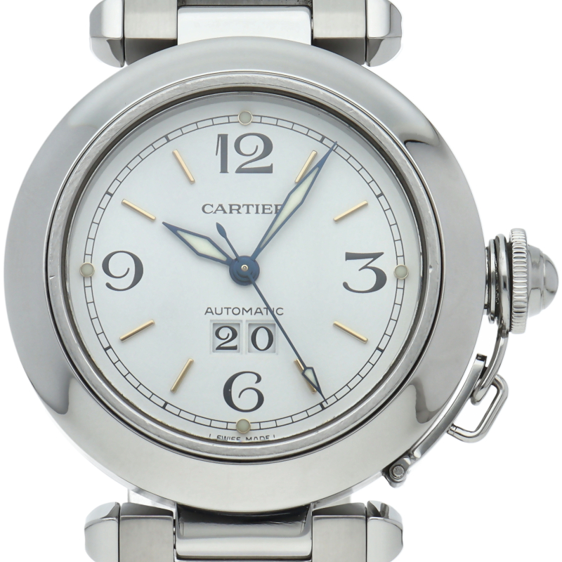カルティエ「パシャC」のビッグデイト搭載モデル(W31044M7)。35mmのユニセックスサイズで、男女問わずご愛用いただけます。清潔感のあるホワイト文字盤に、6時位置の大型日付表示が実用的かつ特徴的。リューズプロテクターがカルティエらしい気品を漂わせ、オンオフ問わず手元を上品に飾る自動巻きウォッチです。