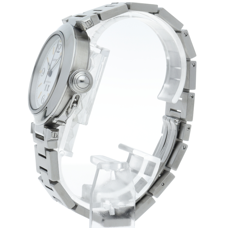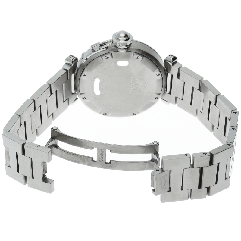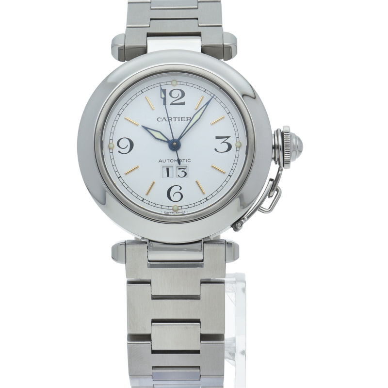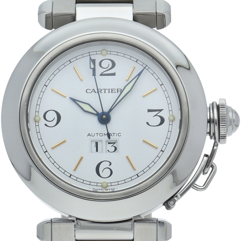 カルティエの人気「パシャC」シリーズ。大きい日付表示が特徴的なビッグデイト。視認性も良くどんなシーンにも活用できるラウンドケースがオシャレな1本。
