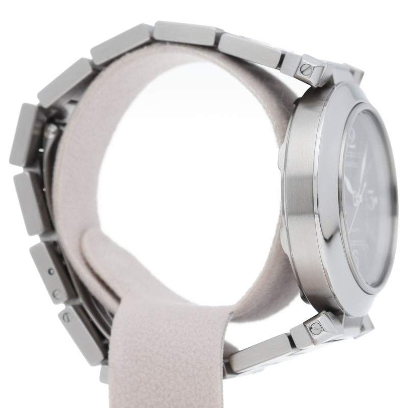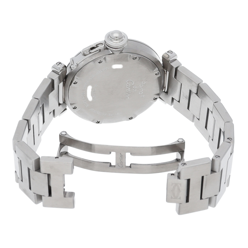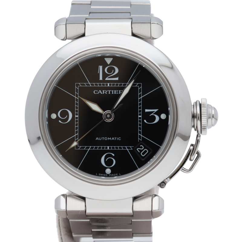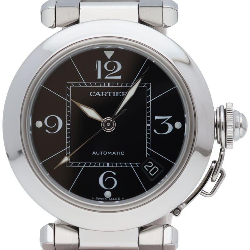 カルティエの人気パシャCシリーズ。4時と5時の間にデイト表示機能が付いた実用性のある1本。どんなシーンにも活用できるラウンドケースがオシャレです。