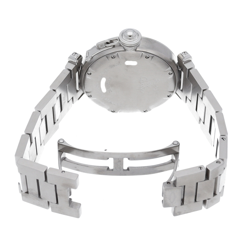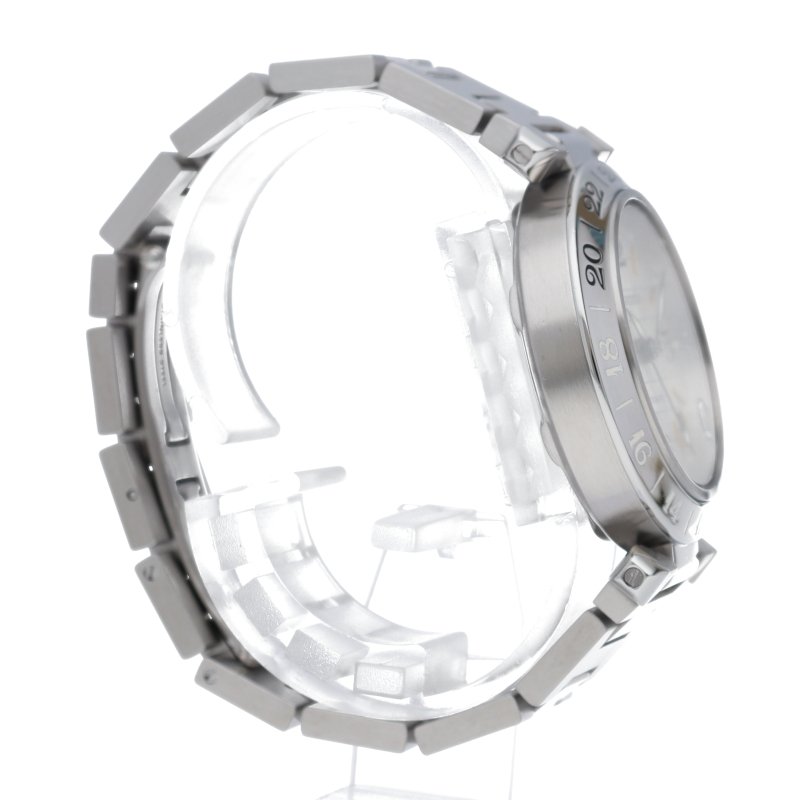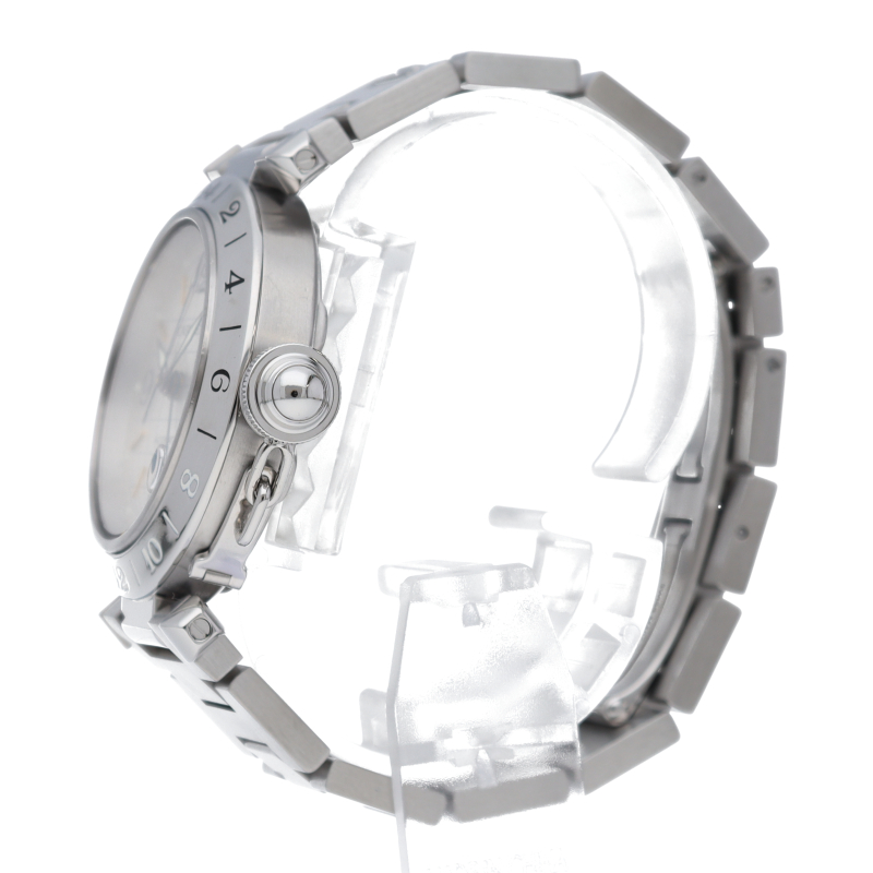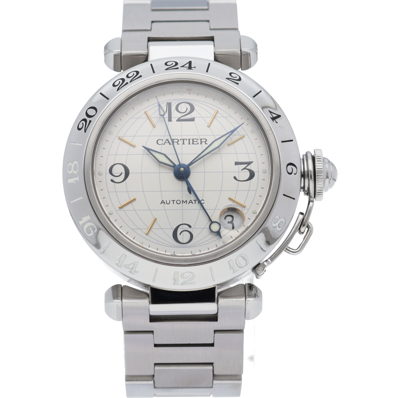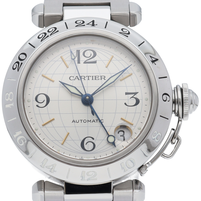 カルティエの人気「パシャC」シリーズ。文字盤に地球儀をモチーフにした放射線状のデザインを持つ、GMT機能搭載モデル。