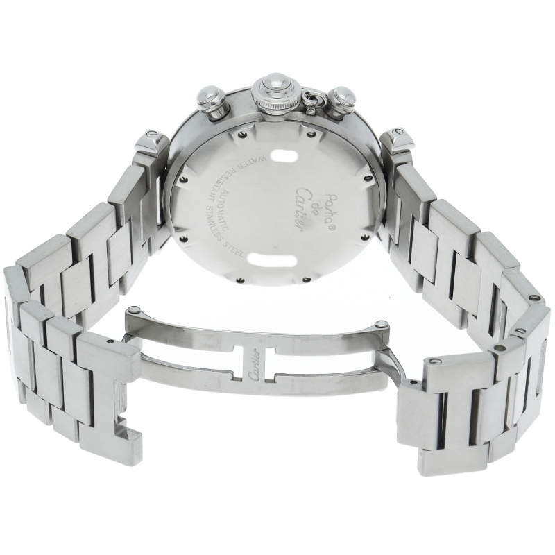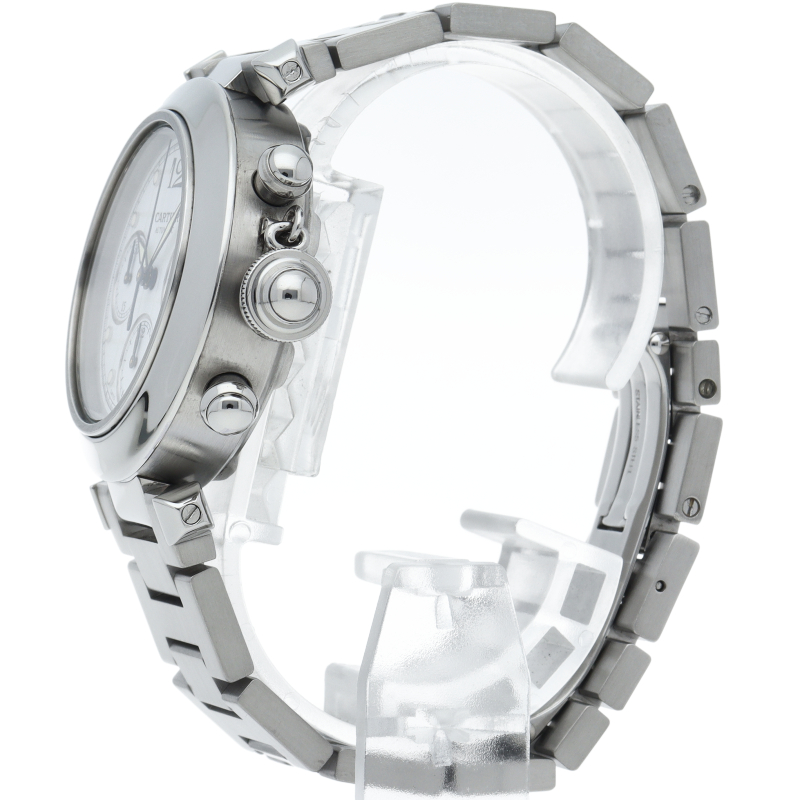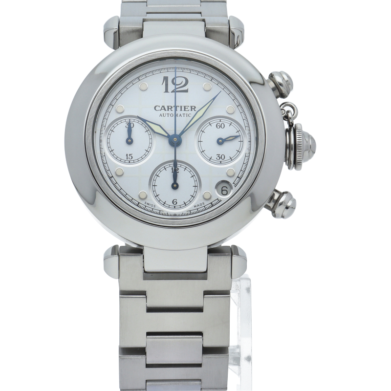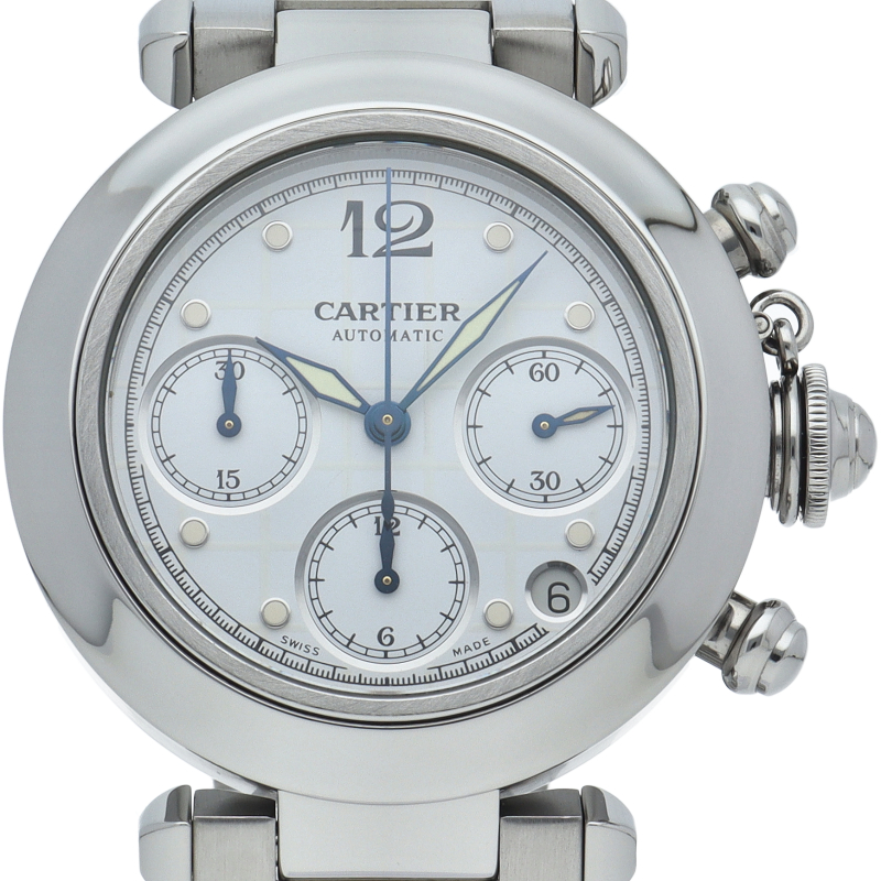カルティエの人気「パシャC」シリーズ。クロノグラフを搭載したモデルでホワイトの文字盤が爽やかな印象を与えるお洒落な時計です。