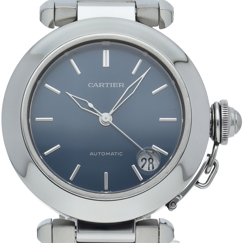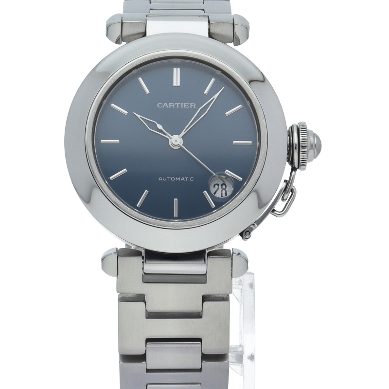 カルティエの人気パシャCシリーズ。4時と5時の間にデイト表示機能が付いた実用性のある1本。どんなシーンにも活用できるラウンドケースがオシャレです。初期型のシンプルなモデルですが、最近だと人気の青文字盤は数が少なくなっています。