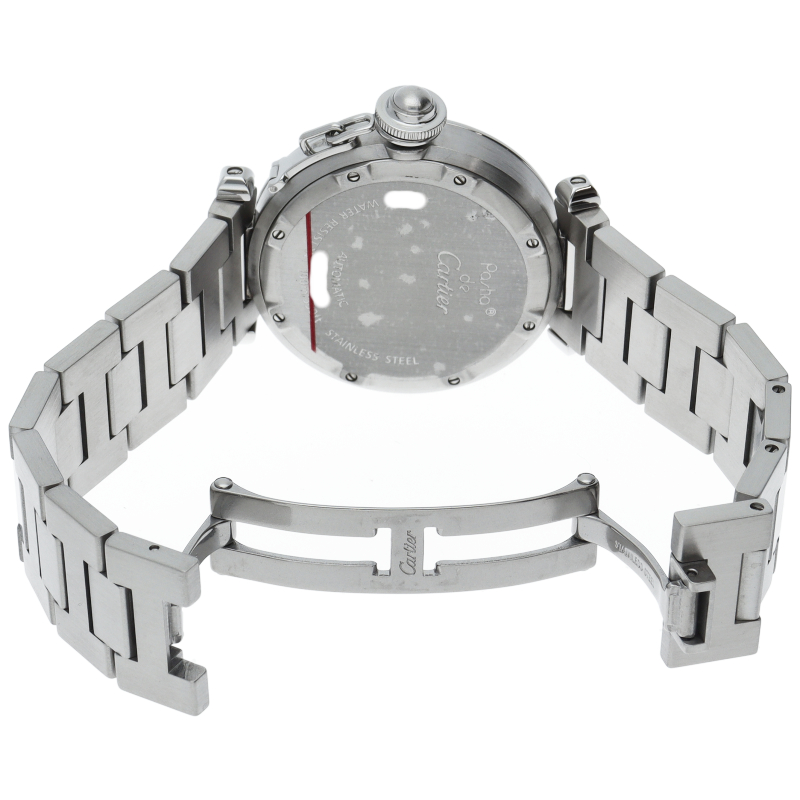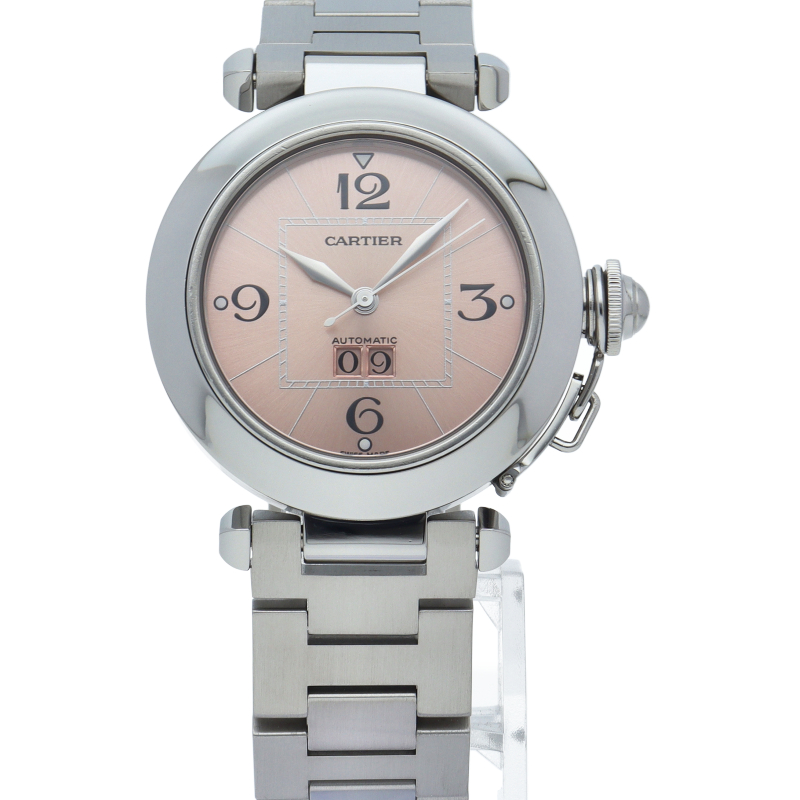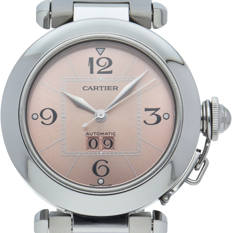 カルティエの人気「パシャC」シリーズ。大きい日付表示が特徴的なビッグデイト。視認性も良くどんなシーンにも活用できるラウンドケースがオシャレな1本。