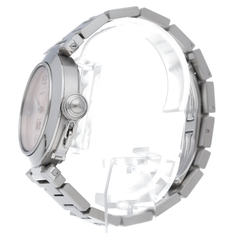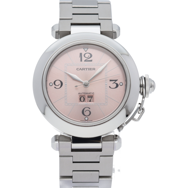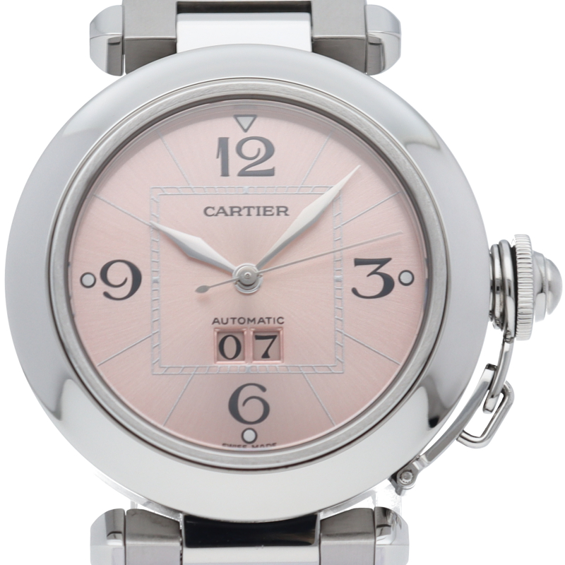 カルティエの人気「パシャC」シリーズ。大きい日付表示が特徴的なビッグデイト。視認性も良くどんなシーンにも活用できるラウンドケースがオシャレな1本。