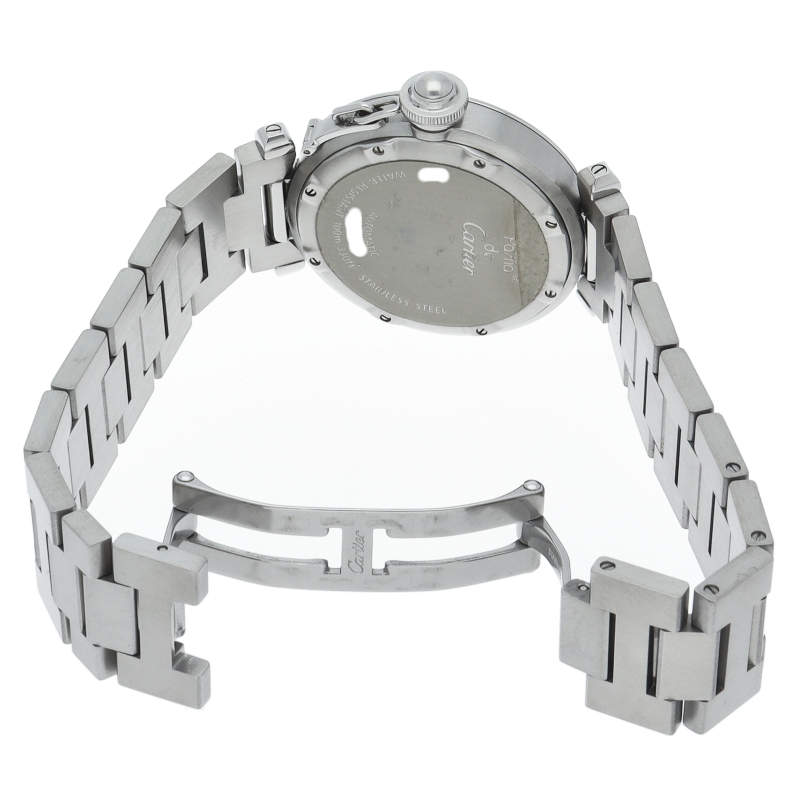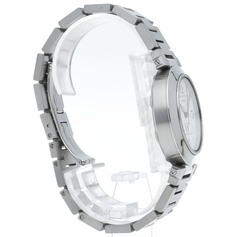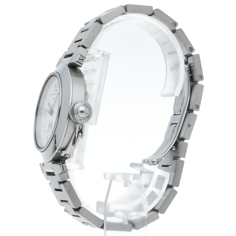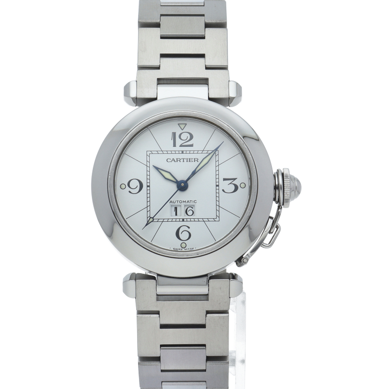 カルティエ「パシャC ビッグデイト」(W31055M7)。6時位置に配された視認性の高い大型デイト表示が特徴の35mmユニセックスモデルです。清潔感あふれるホワイト文字盤とステンレスの輝きが、洗練された都会的な印象を演出。独創的なリューズカバーと機能美が融合し、生産終了後も男女問わず愛され続ける、カルティエらしい気品漂う名作です。