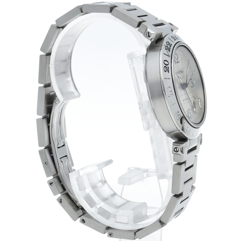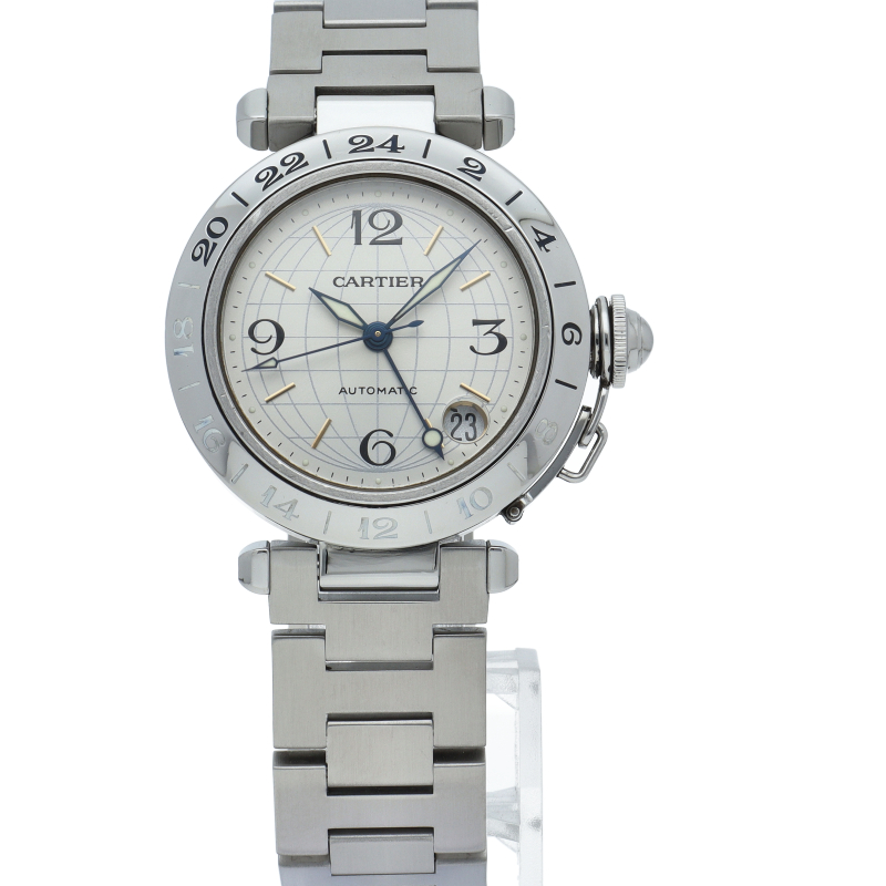 カルティエの人気「パシャC」シリーズ。文字盤に地球儀をモチーフにした放射線状のデザインを持つ、GMT機能搭載モデル。