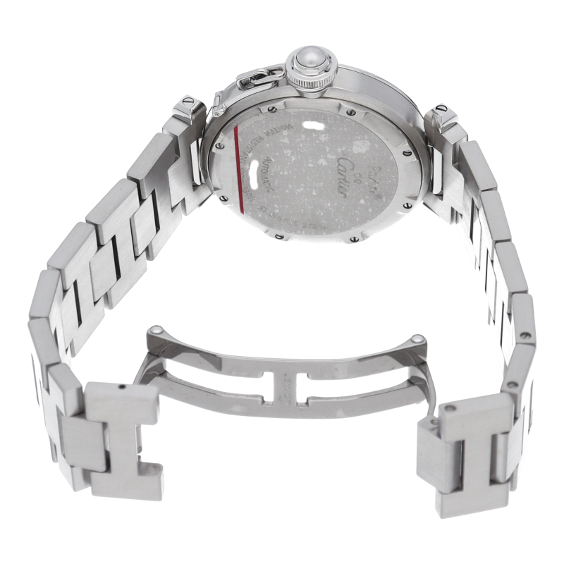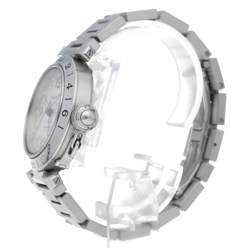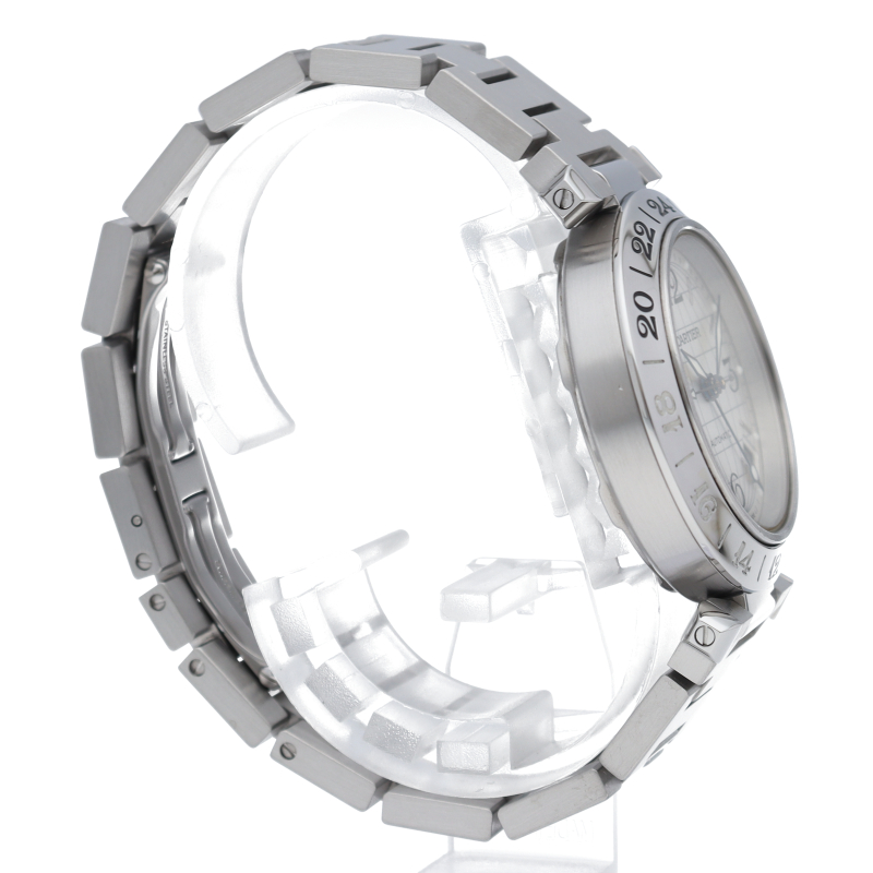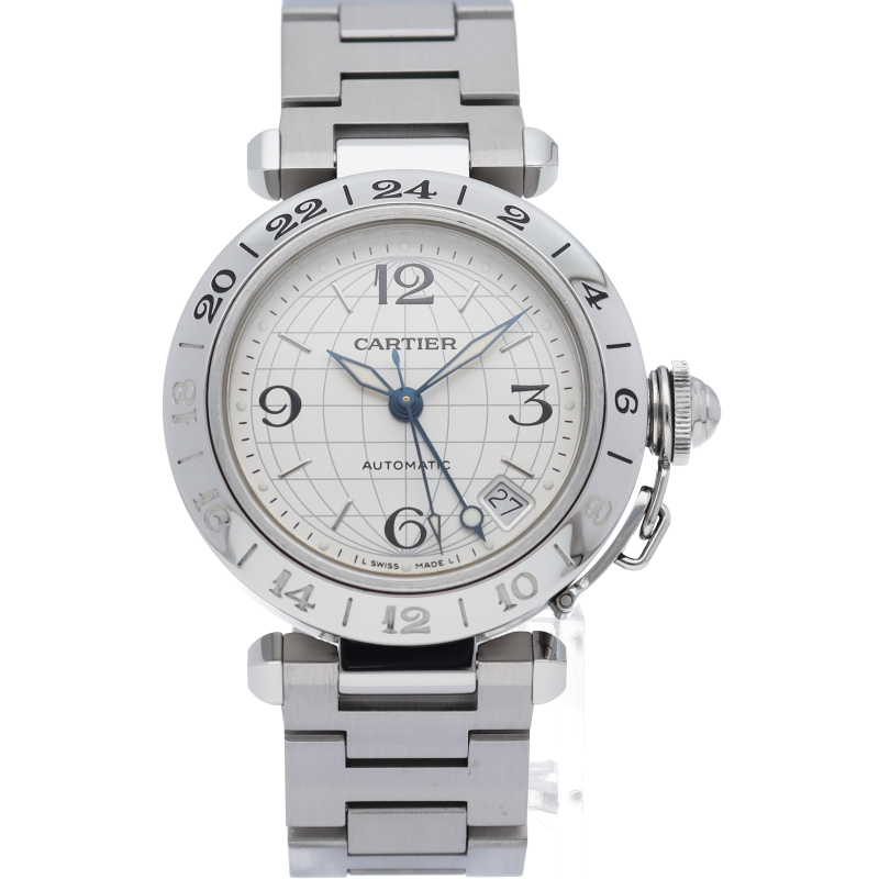 カルティエの人気「パシャC」シリーズ。文字盤に地球儀をモチーフにした放射線状のデザインを持つ、GMT機能搭載モデル。