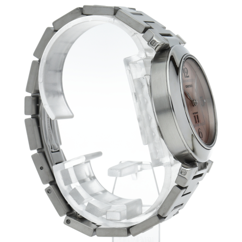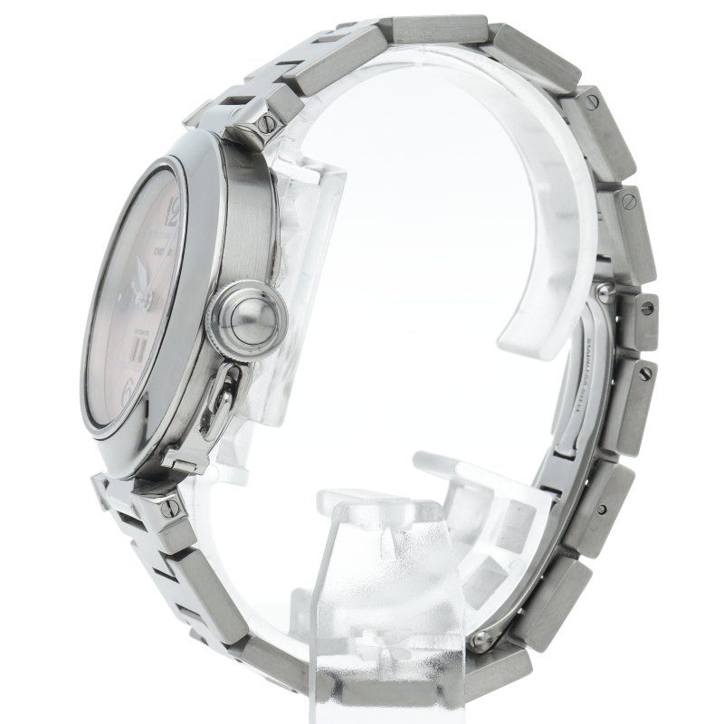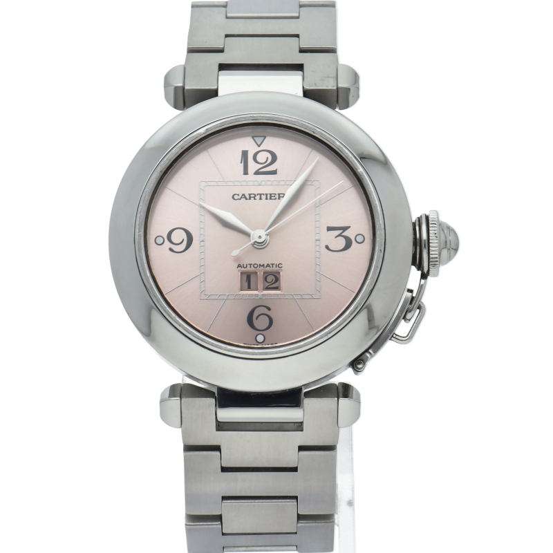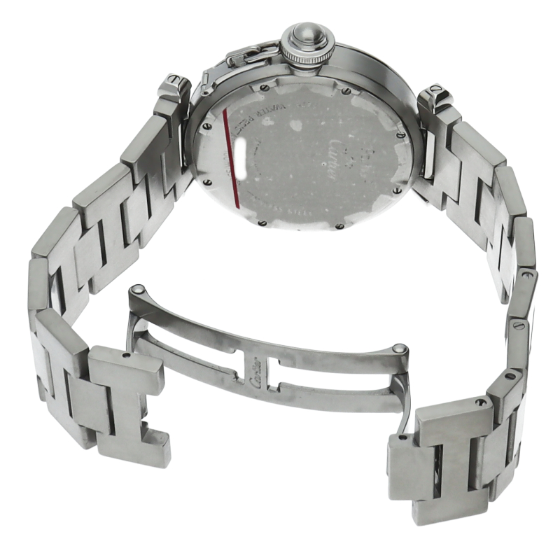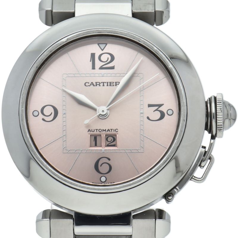 カルティエの人気「パシャC」シリーズ。大きい日付表示が特徴的なビッグデイト。視認性も良くどんなシーンにも活用できるラウンドケースがオシャレな1本。