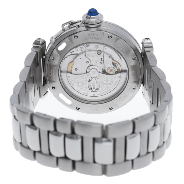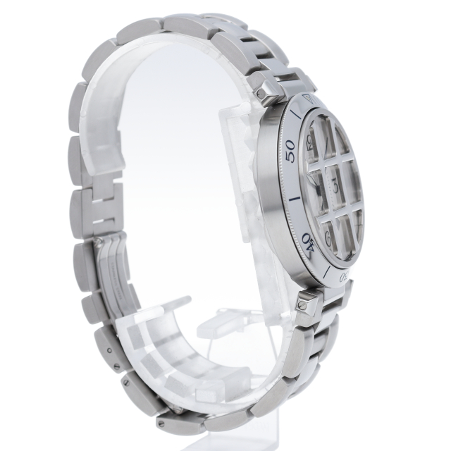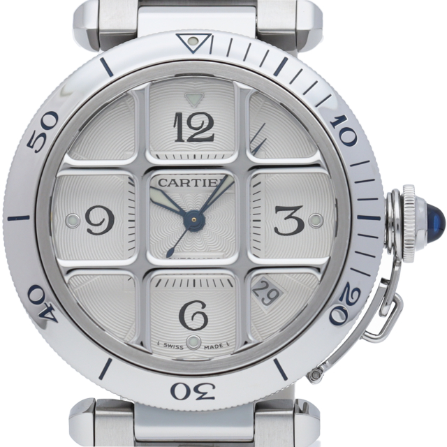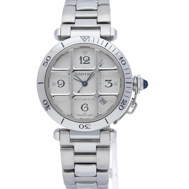 カルティエの人気シリーズ「パシャ」。グリッドを使用したインパクトあるデザインが特徴的な1本。グリッドは取り外し可能でシンプルなフェイスにも変更可能です。