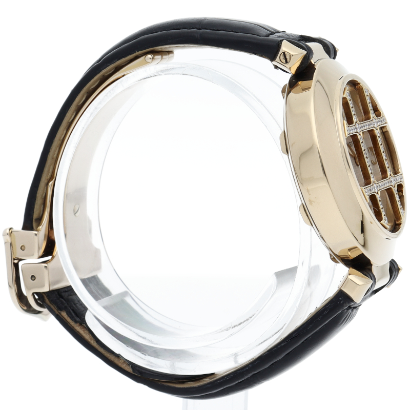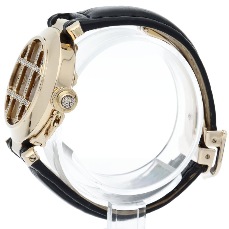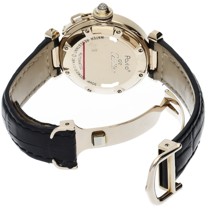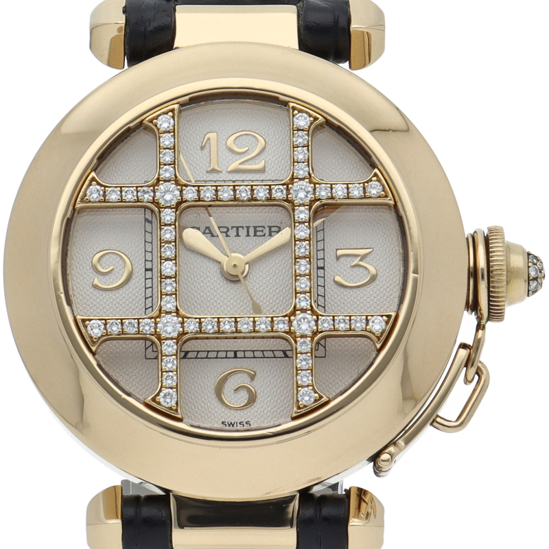 カルティエの人気シリーズ「パシャ」。グリッドを使用したインパクトあるデザインが特徴的な1本。グリッドは取り外し可能でシンプルなフェイスにも変更可能です。