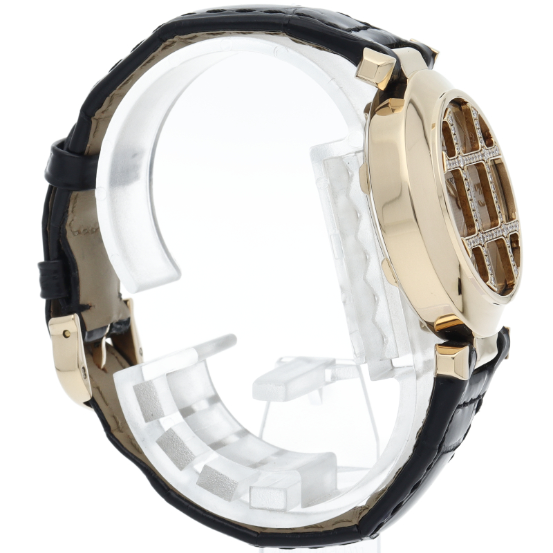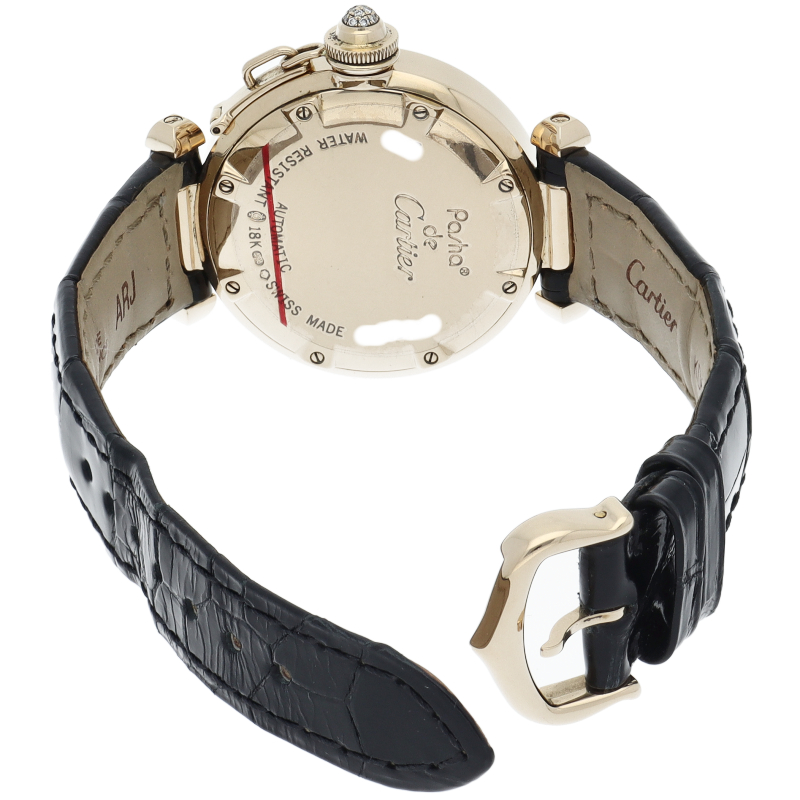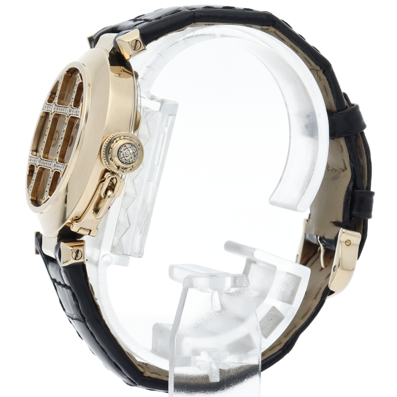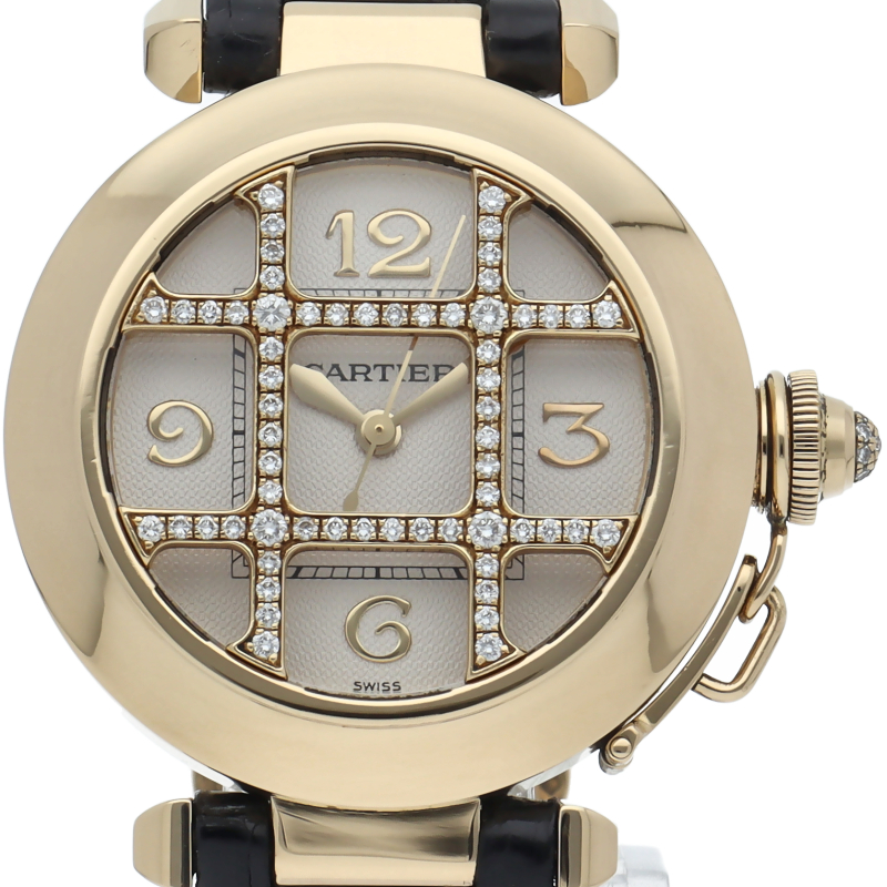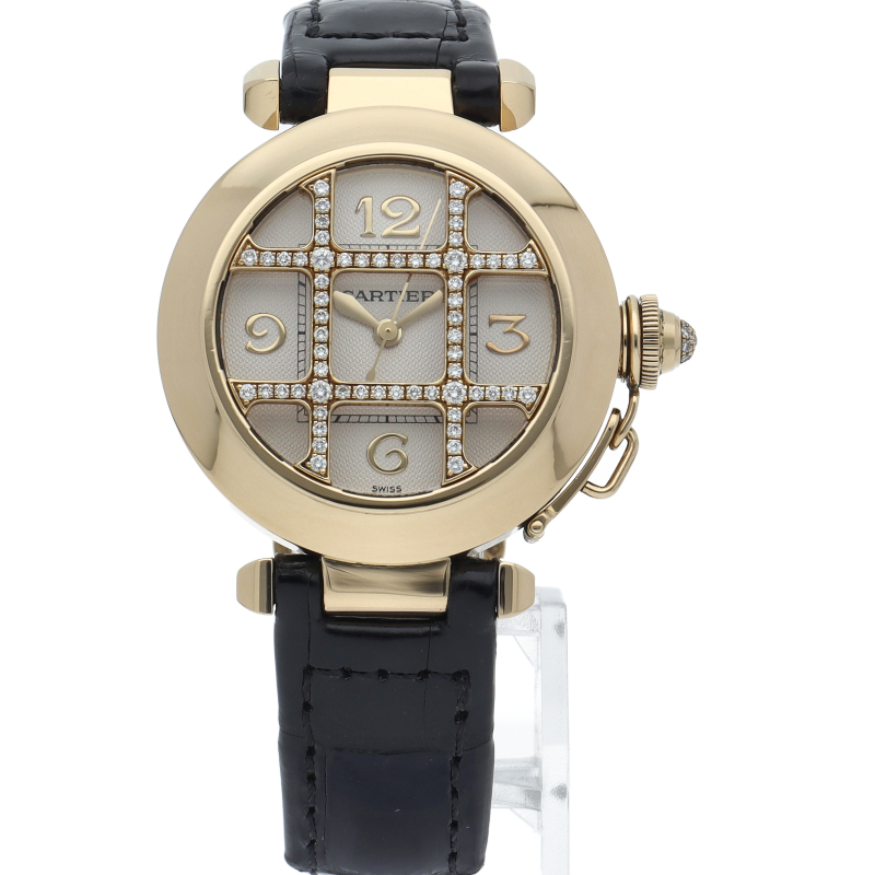 カルティエの人気シリーズ「パシャ」。グリッドを使用したインパクトあるデザインが特徴的な1本。グリッドは取り外し可能でシンプルなフェイスにも変更可能です。